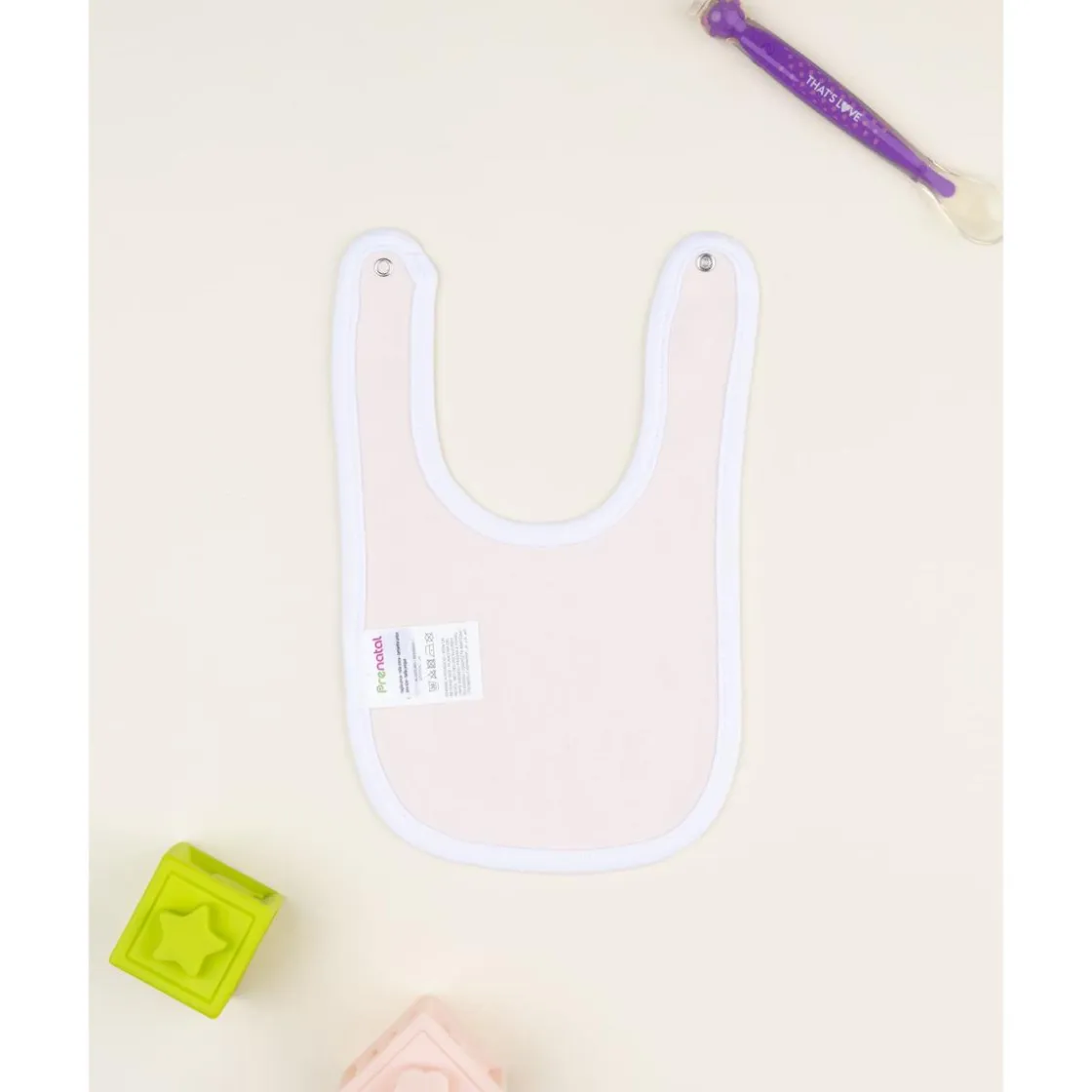 Babero para niña en tono rosa claro con pequeño estampado allover blanco en contraste. Los bordes en blanco liso completan su diseño suave y delicado. Se cierra fácilmente con botón a presión en la parte trasera. Perfecto para acompañar las comidas sin perder estilo.