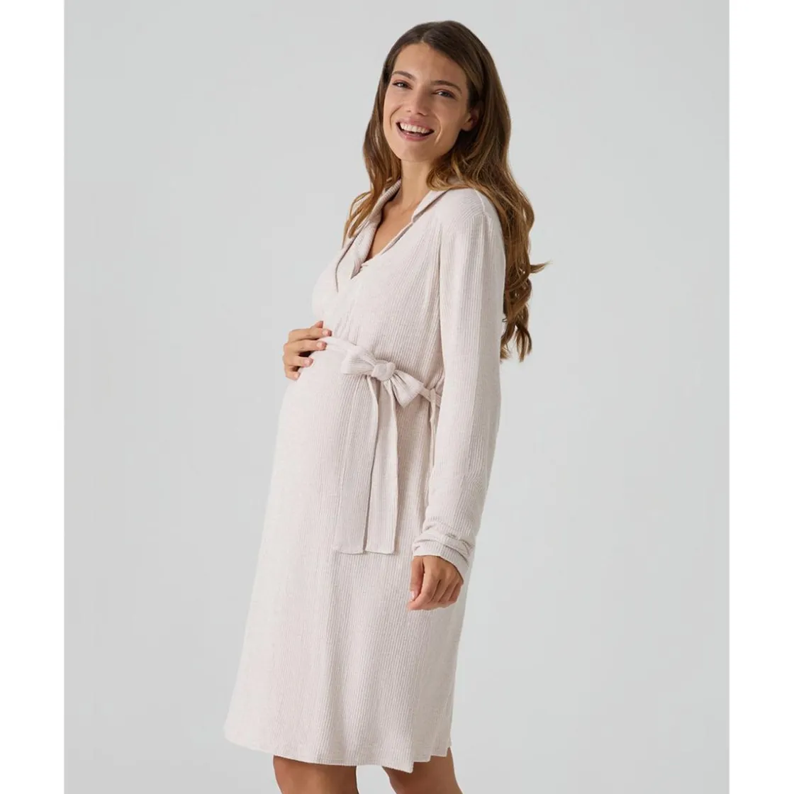 Bata premamá en beige claro con efecto tricot suave. Su cinturón removible permite anudar bajo el pecho durante el embarazo o a la cintura tras el parto, adaptándose a la silueta en cada etapa. De manga larga y caída envolvente, ofrece confort para casa, hospital o las primeras tomas, con una estética limpia que combina con camisones y pijamas de lactancia.