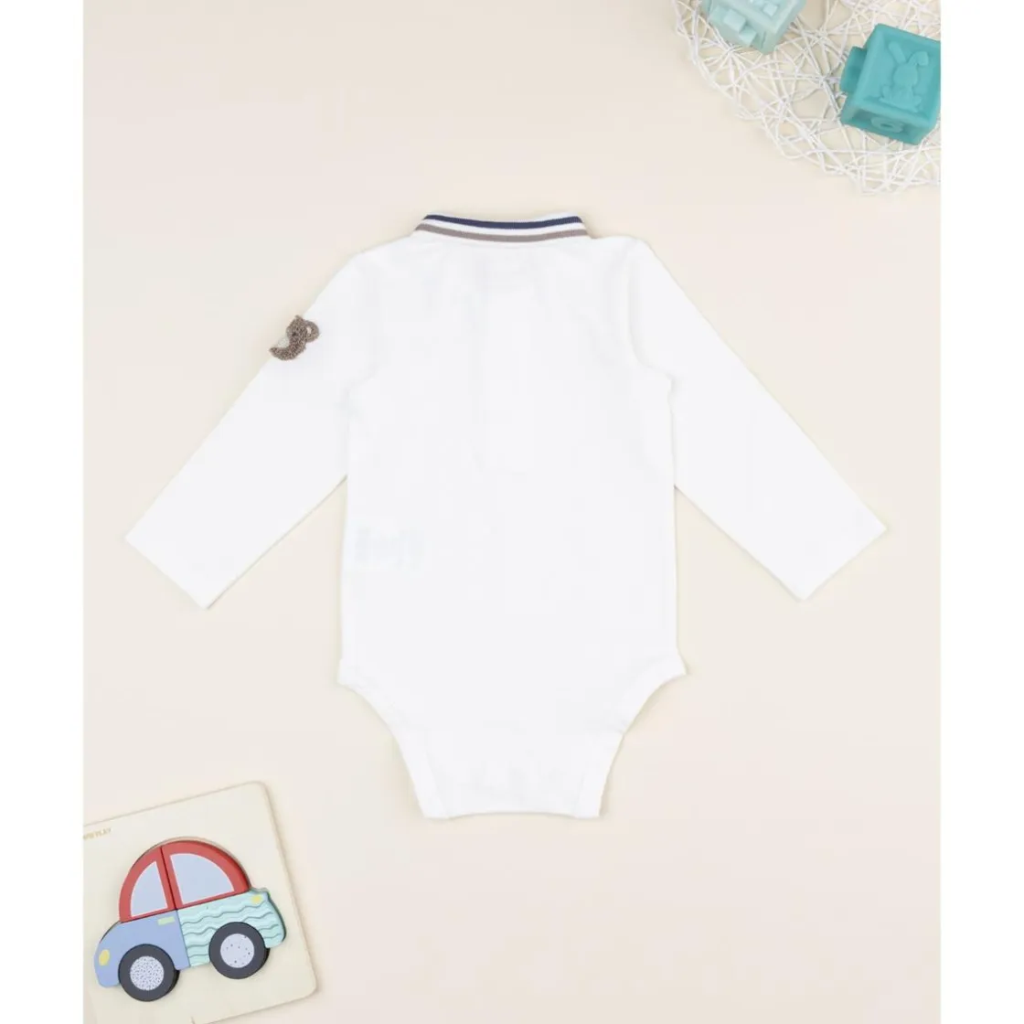 Este body de algodón para niño es suave, cómodo y seguro, ideal para los primeros meses de vida. Su base blanca se complementa con un delicado patch de oso en el cuello, aportando un toque divertido y tierno. Las mangas largas y los prácticos botones automáticos en el delantero y en la entrepierna facilitan el cambio del pañal y la puesta diaria. Fabricado en 95% algodón y 5% elastano, garantiza suavidad, elasticidad y transpirabilidad, cuidando la piel sensible del bebé. Perfecto para combinar con pantalones, gorras o chaquetas en el día a día, este body es funcional, cómodo y adorable.