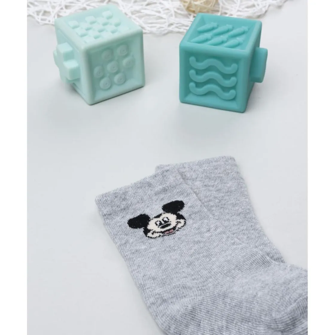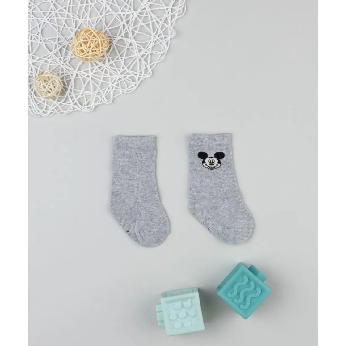 Divertidos calcetines altos para niño en color gris claro con pequeño estampado de Mickey Mouse. Su tejido elástico ofrece un ajuste perfecto sin apretar, ideal para acompañar cualquier look diario.