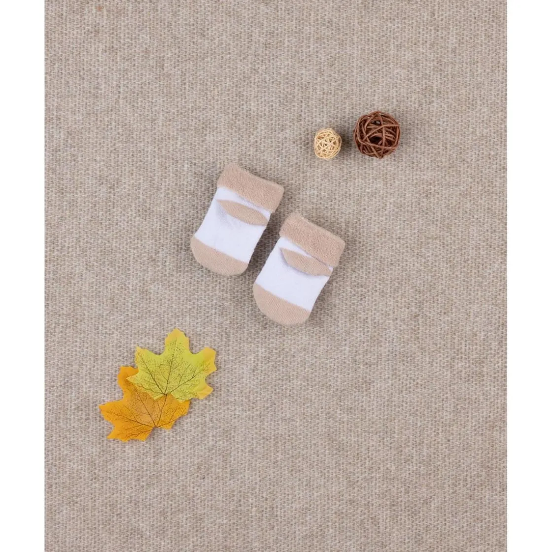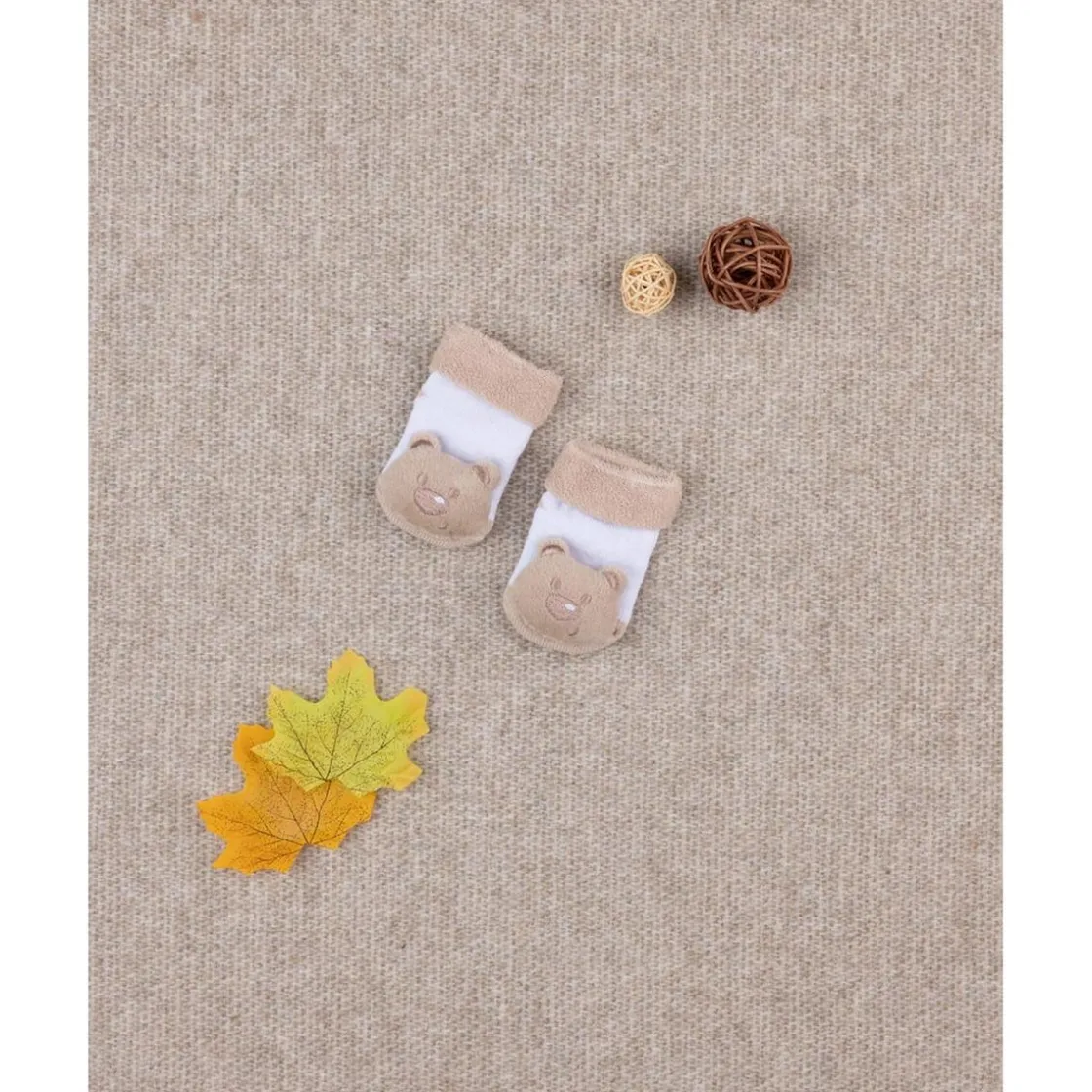 Adorables calcetines con sonajero para bebé. Diseño en blanco y beige con un dulce oso en relieve a juego.