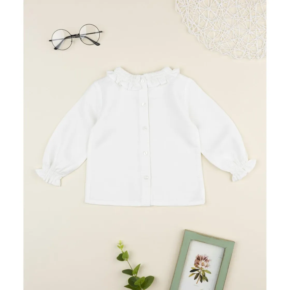 Esta camisa infantil de manga larga se presenta en color blanco con cuello volante en la misma tonalidad. Confeccionada en lyocell, aporta suavidad y caída ligera. Su cierre trasero con botones la convierte en una prenda práctica y refinada, adecuada para looks casuales o más arreglados.