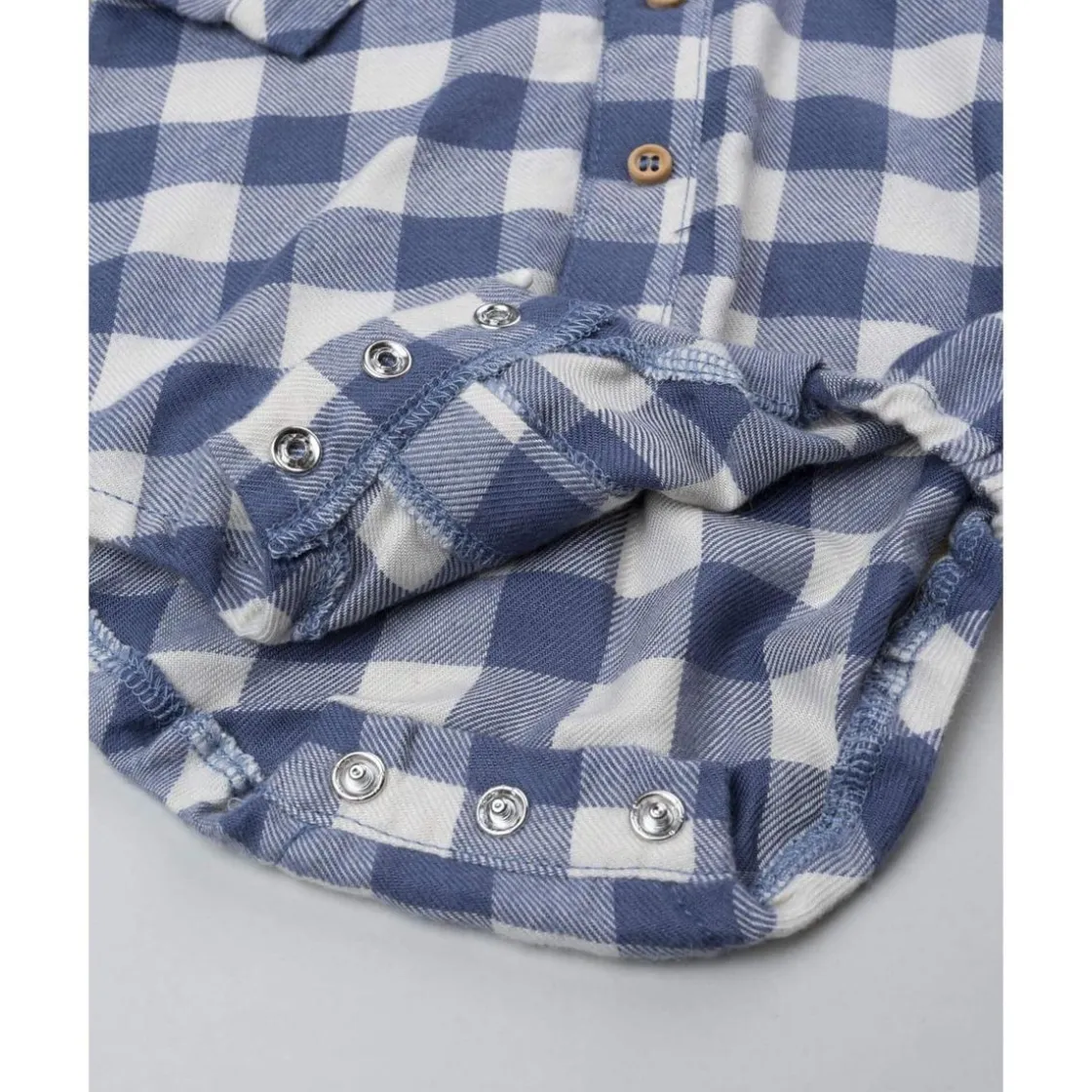 La camisa-body de franela une el aspecto pulido de una camisa con la practicidad del body. Presenta cuadro blanco y azul de inspiración casual y bolsillo en el pecho a la altura del corazón. Los botones en el delantero y los automáticos en la entrepierna agilizan el vestido y mantienen la prenda en su sitio, evitando que se salga del pantalón mientras juega.