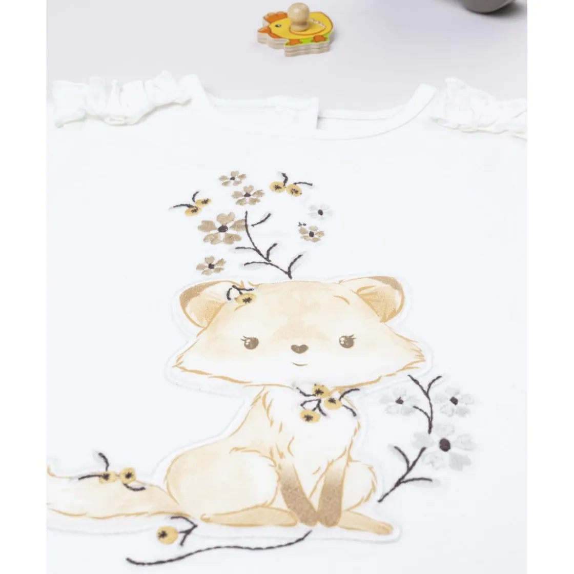 Camiseta de manga larga para niña en blanco con una colorida ilustración de zorrito. Muy cómoda gracias a los botones automáticos en la espalda. Ideal para outfits casuales y fáciles de combinar.