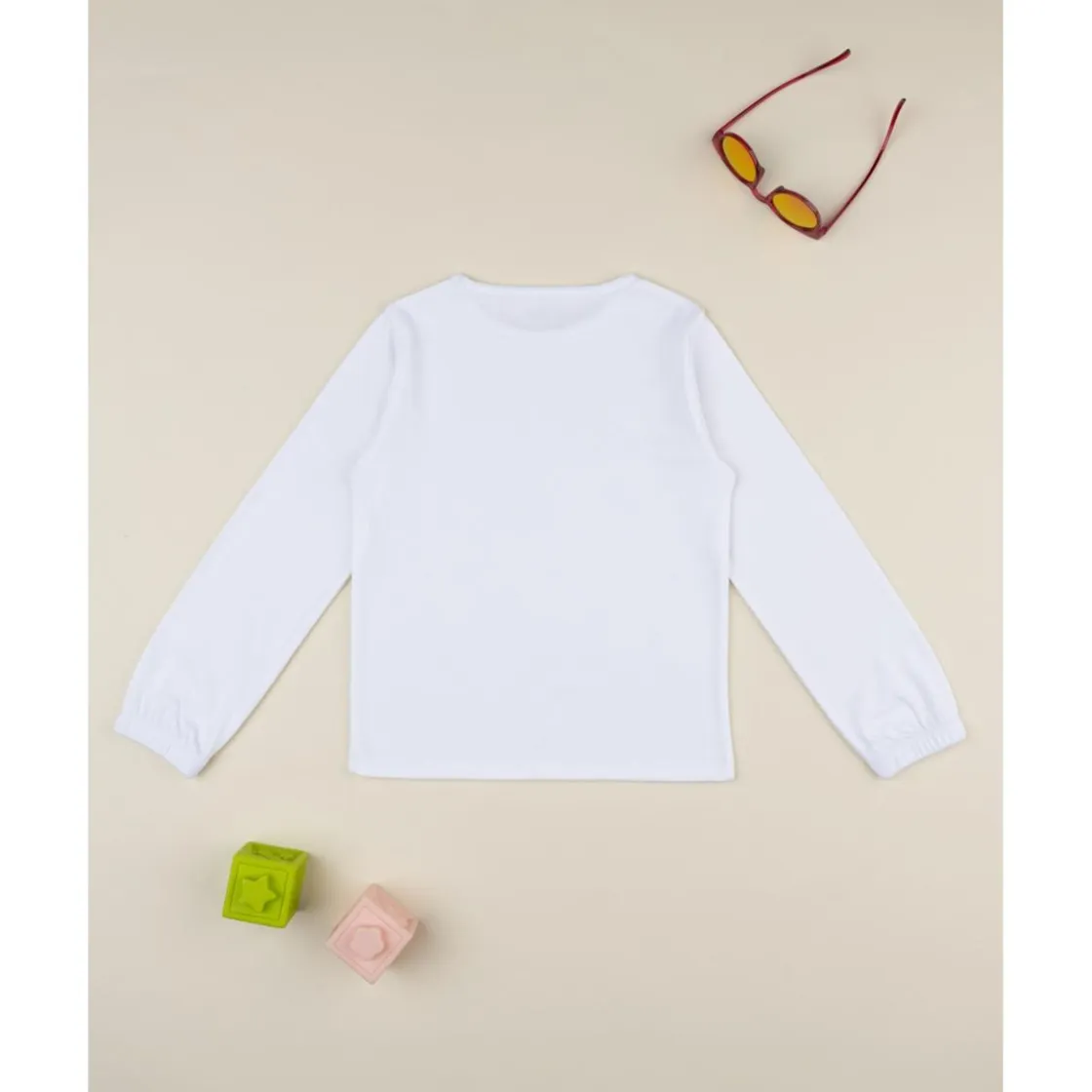 Básica camiseta blanca de manga larga para niña, perfecta para combinar con cualquier conjunto. Su tejido suave de algodón y los puños elásticos aportan comodidad durante todo el día.