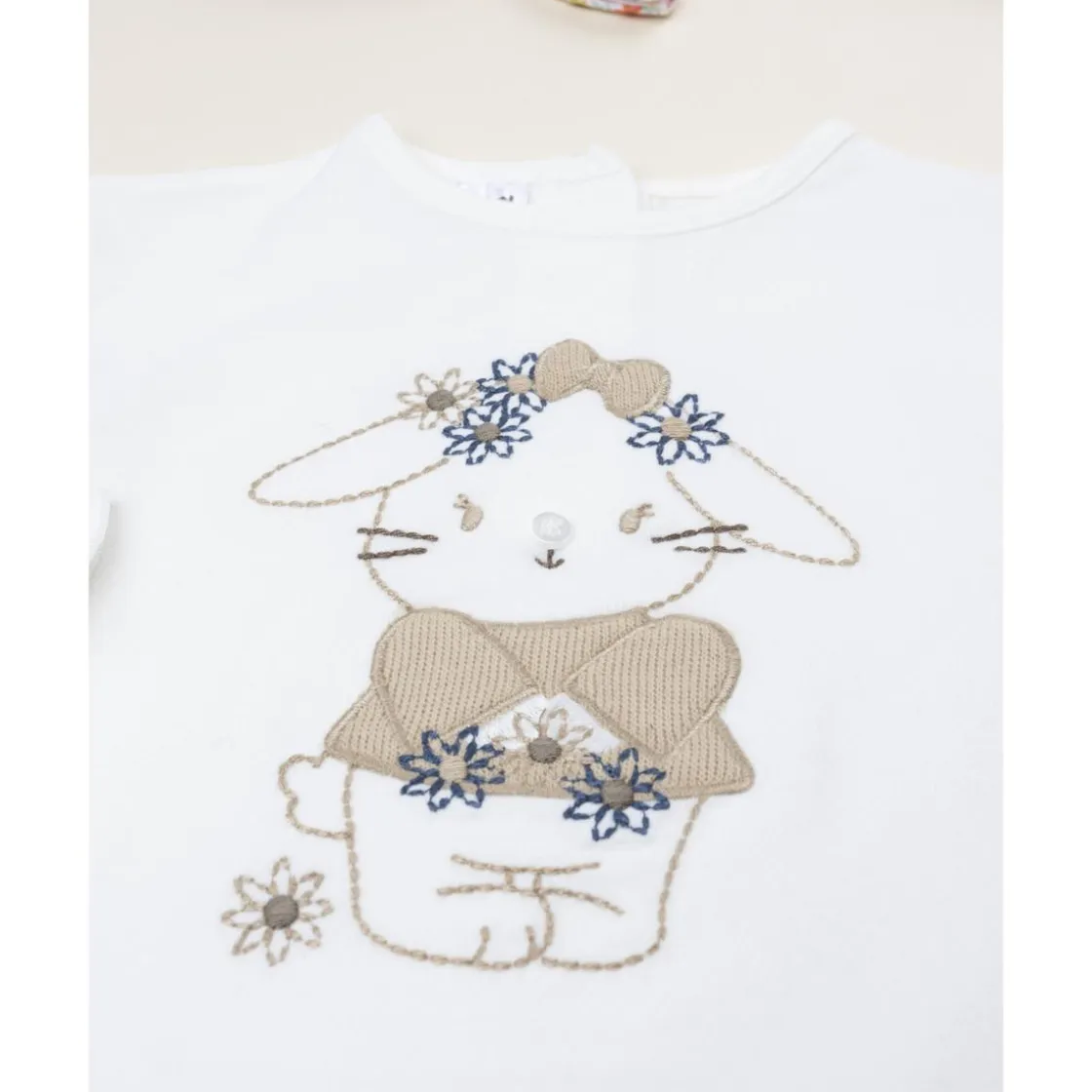Características: Camiseta de manga larga, color blanco panna, estampado conejito, puños elásticos, cierre con botones automáticos, corte suave y cómodo.