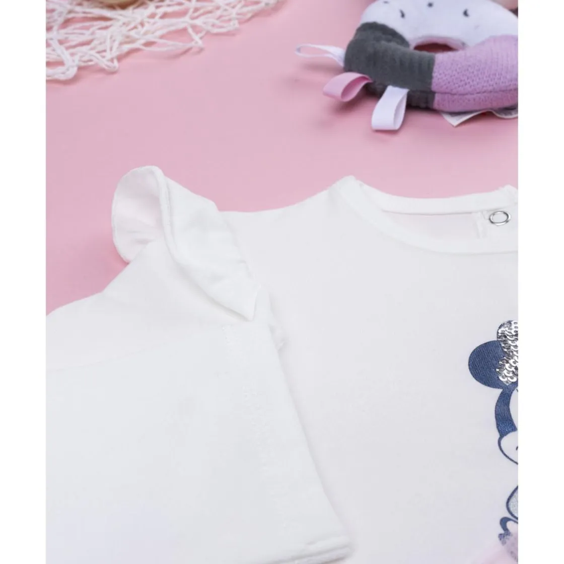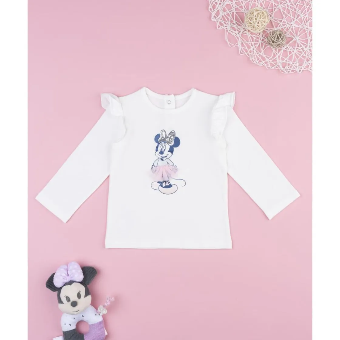 Camiseta casual de manga larga para niña en blanco con estampado Minnie coordinado y detalles frill. Botones automáticos en la espalda facilitan poner y quitar la prenda, asegurando una vestibilidad cómoda.