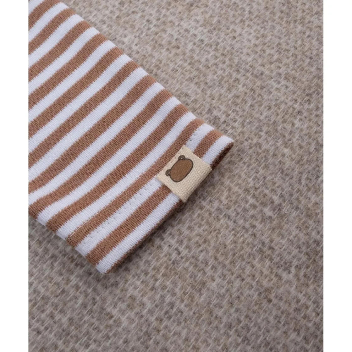 Camiseta básica de manga larga para niño con estampado de rayas marrones. Ajuste cómodo con botones automáticos en la espalda. Ideal para ocasiones casuales y combinable. Algodón Oeko-Tex certificado. Solo prenda incluida.