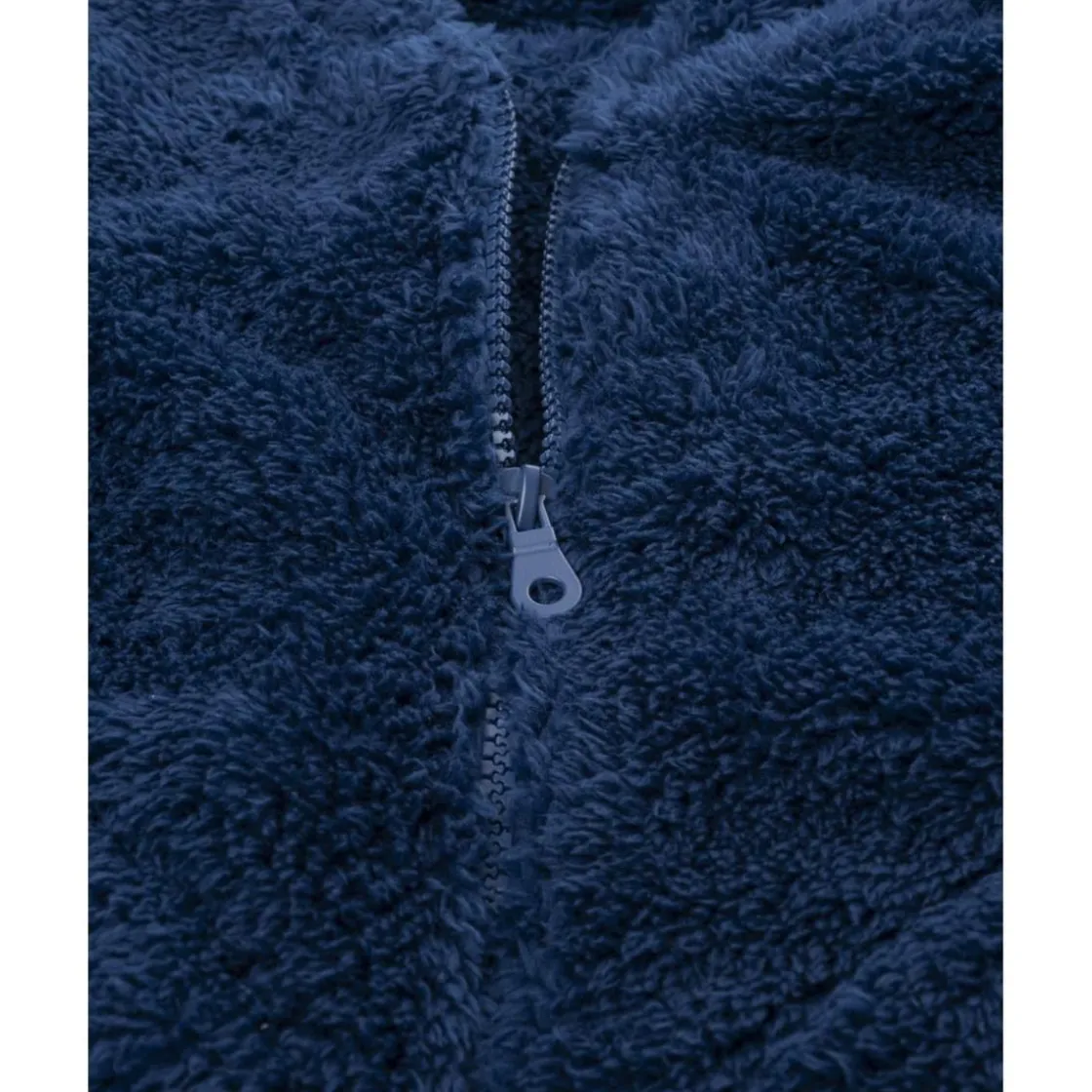 Este cardigan vestidor azul unisex combina comodidad y suavidad en un diseño acogedor de pelo sintético. Presenta un tono azul noche con bolsillos laterales y cierre frontal con cremallera para un uso práctico. Ideal para abrigar a los más pequeños en casa o durante sus momentos de relax.