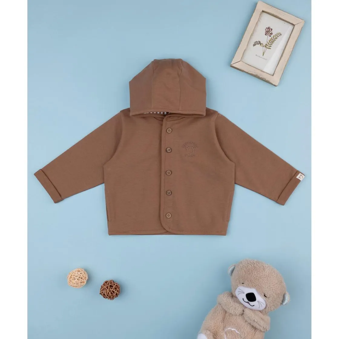 Chaqueta de estilo casual para niño, confeccionado en color marrón con capucha. Su ajuste cómodo se completa con botones frontales a tono, siendo una prenda versátil y fácil de combinar para cualquier ocasión.