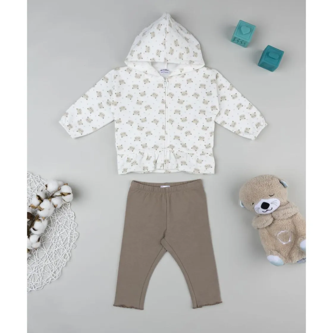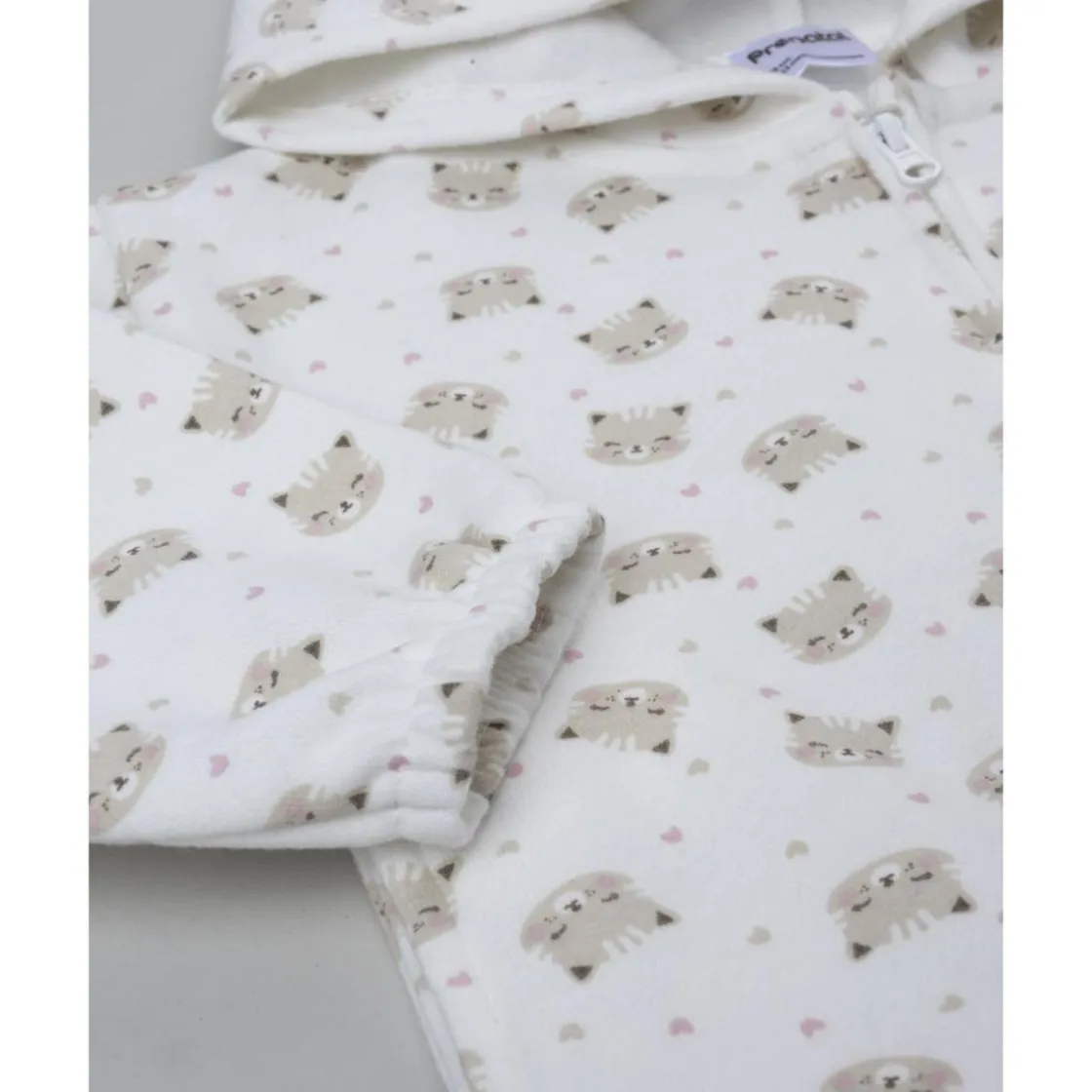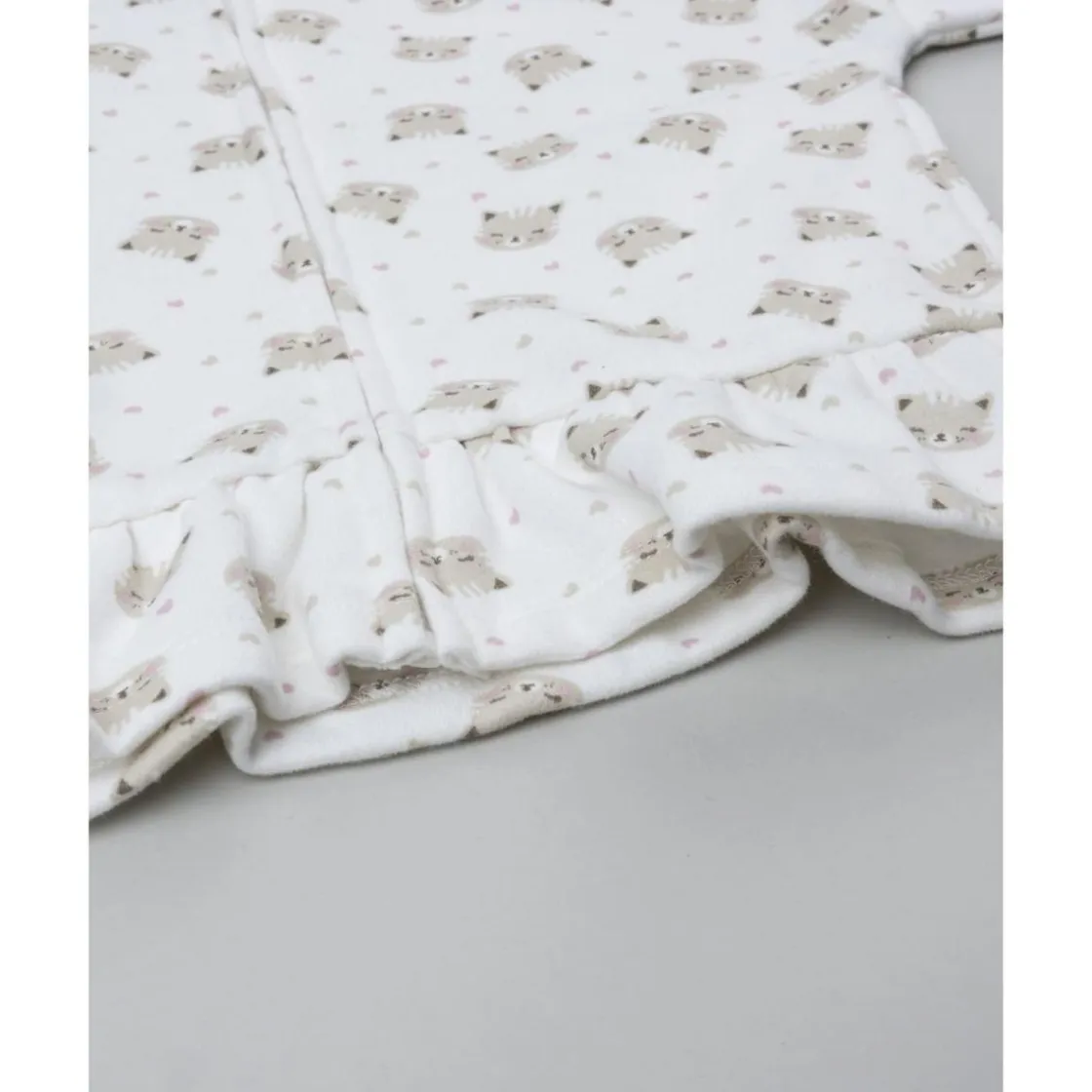 El conjunto está formado por sudadera blanca con capucha y estampado allover de gatitos, adornada con un volante inferior, y leggings marrones de cintura elástica. Una combinación tierna y práctica para el día a día.