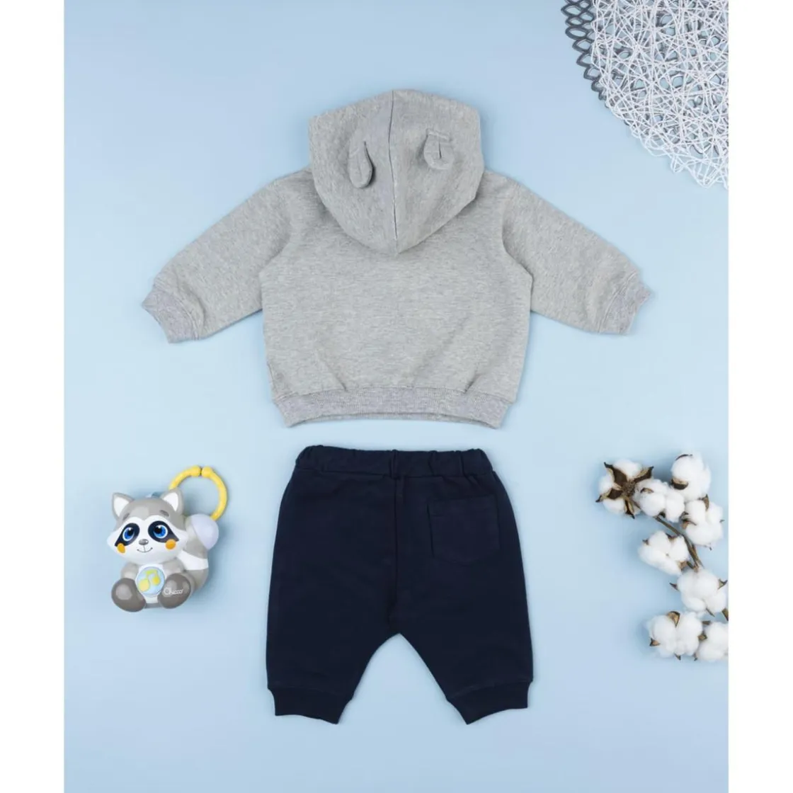 Calentito chándal de felpa para niño compuesto por sudadera gris con dibujo de perrito con orejas aplicadas y pantalón azul a juego. Cintura ajustable con cordón y bolsillo delantero tipo canguro.