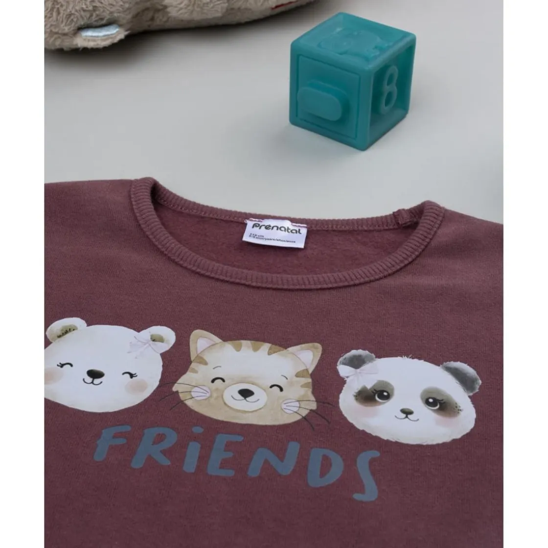 Conjunto casual para niña compuesto por sudadera burdeos de cuello redondo con estampado frontal y volantes diagonales, y pantalón azul liso con cintura ajustable mediante cordón y bajos elásticos. Un binomio cómodo para el cole y el tiempo libre, con color y detalles que elevan el look sin renunciar al confort.