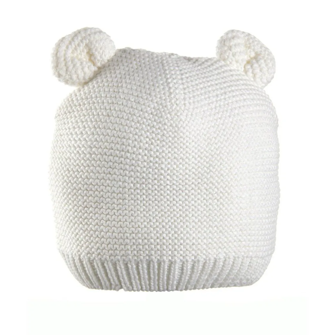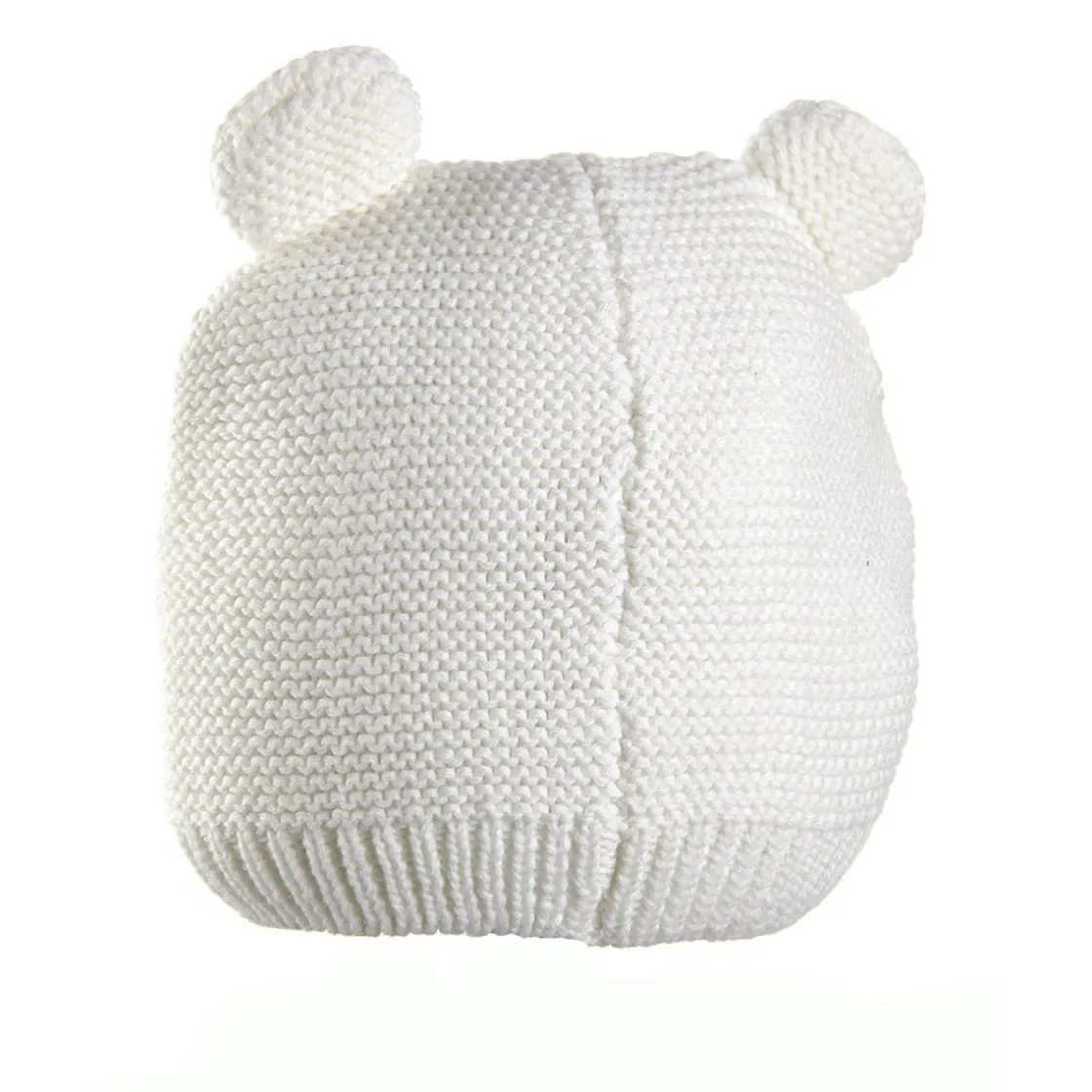 Suave sombrero de ganchillo blanco con simpáticas orejas ton sur ton aplicadas.