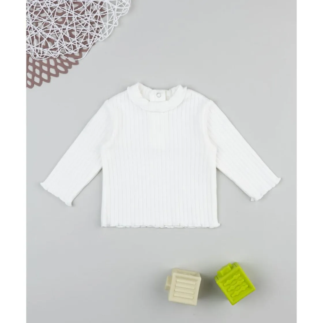 Este jersey infantil de manga larga en canalé blanco crudo es un básico cómodo y versátil. Con cuello alto y botones automáticos en la espalda, resulta práctico para vestir a diario.