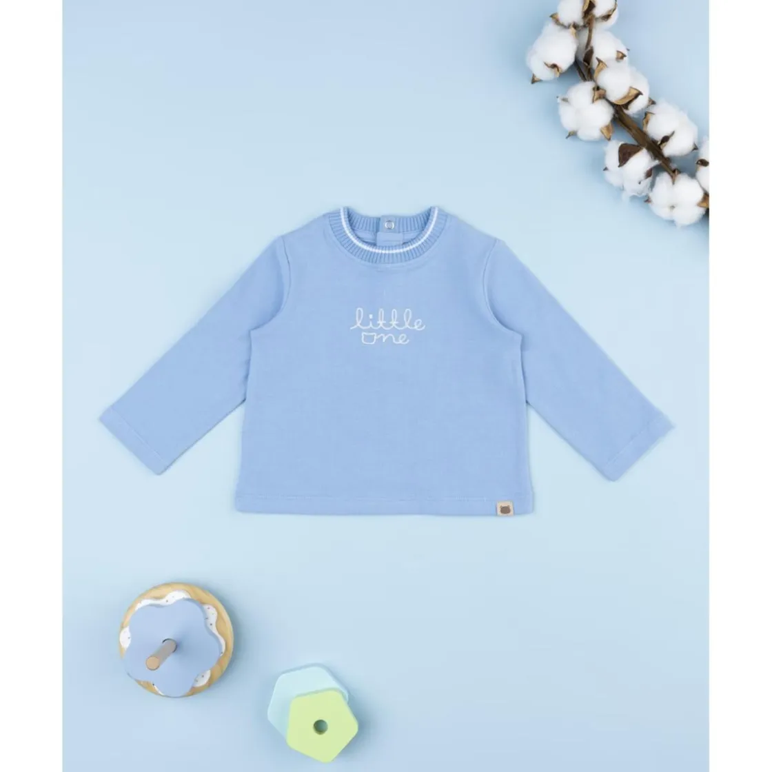 El jersey azul de niño con texto “Little Me” combina suavidad, diseño y practicidad. Confeccionado en algodón elástico certificado OEKO-TEX®, presenta un tacto agradable y una ligera elasticidad que se adapta a los movimientos. Su tono azul celeste y la inscripción frontal aportan un estilo moderno y dulce.