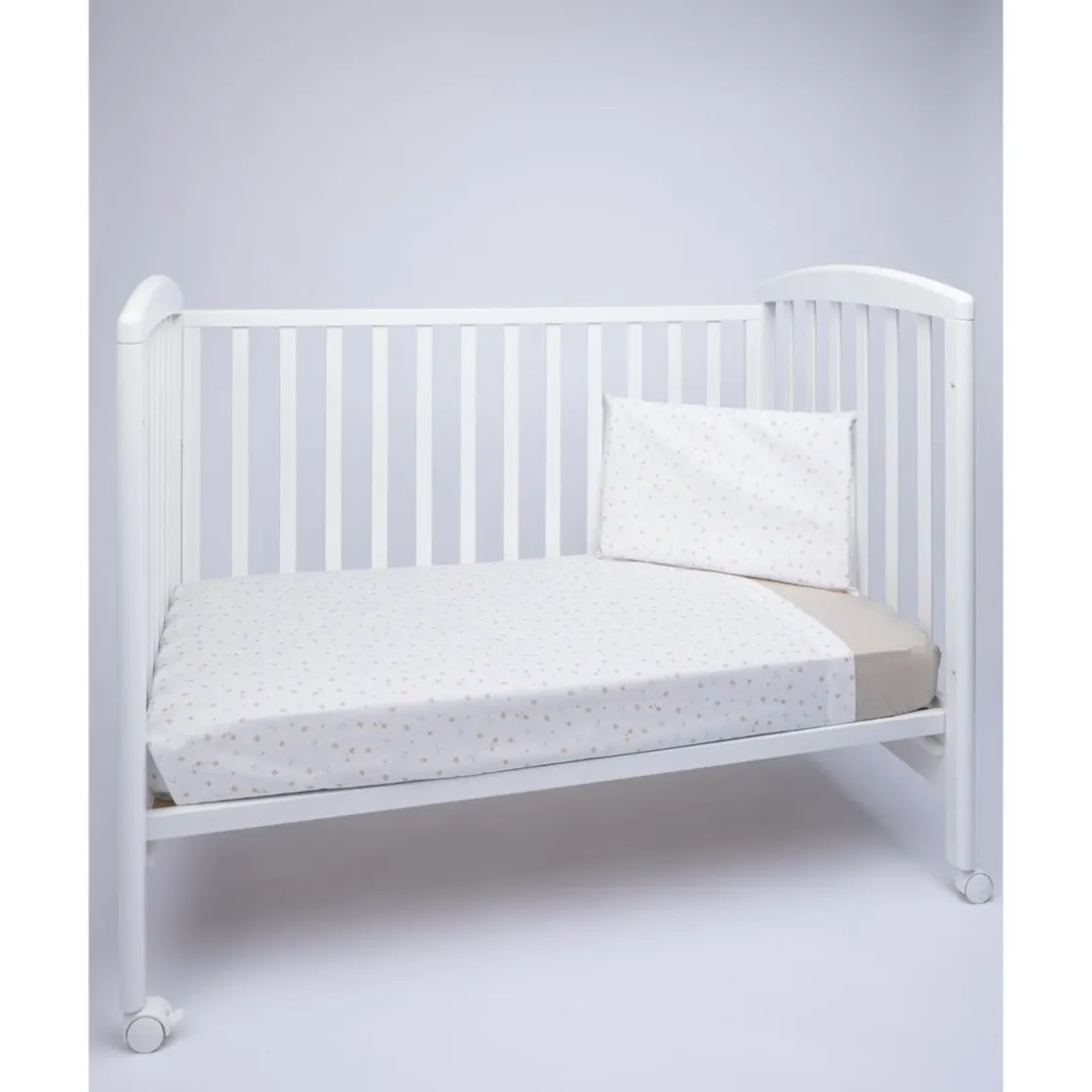 Set infantil con delicados florecillas naranjas sobre fondo blanco. Incluye sábana bajera con elásticos, sábana superior y funda de almohada. Costuras reforzadas y bordes dobles para mayor durabilidad. Diseño alegre que estimula visualmente al bebé.