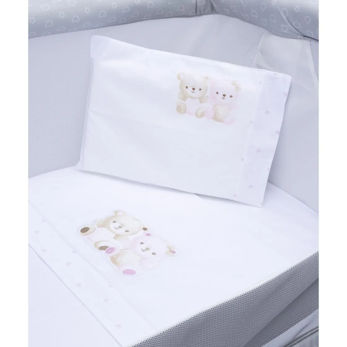 La sábana superior es blanca con encantadoras ilustraciones de ositos, al igual que la funda de almohada. La sábana bajera es blanca lisa y también puede utilizarse como encimera.
