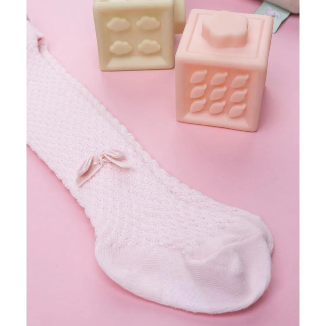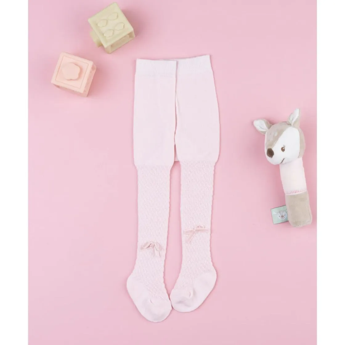 El leotardo rosa para recién nacida es suave y cómodo, con un diseño de punto trenzado que aporta calidez y estilo. Incluye pequeños lazos aplicados en tono coordinado que lo hacen aún más tierno.