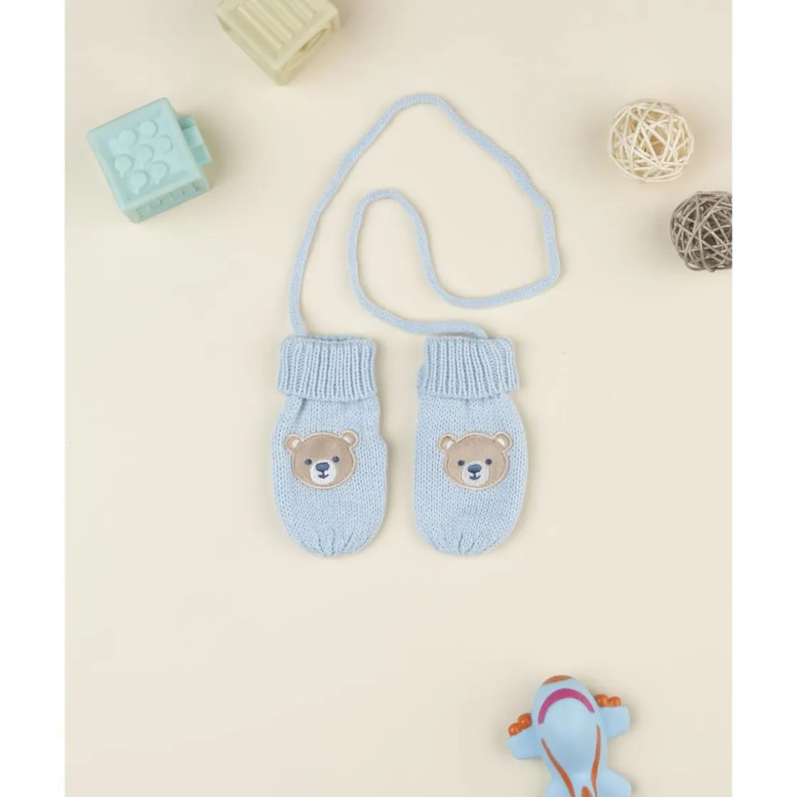 Las manoplas azules con osito son el complemento perfecto para mantener las manos del bebé cálidas y protegidas. Realizadas en acrílico suave, ofrecen un tacto agradable y una excelente retención del calor. Su diseño incluye un dulce bordado de osito, un práctico cordón de unión y vuelta acanalada en el puño para un mejor ajuste.