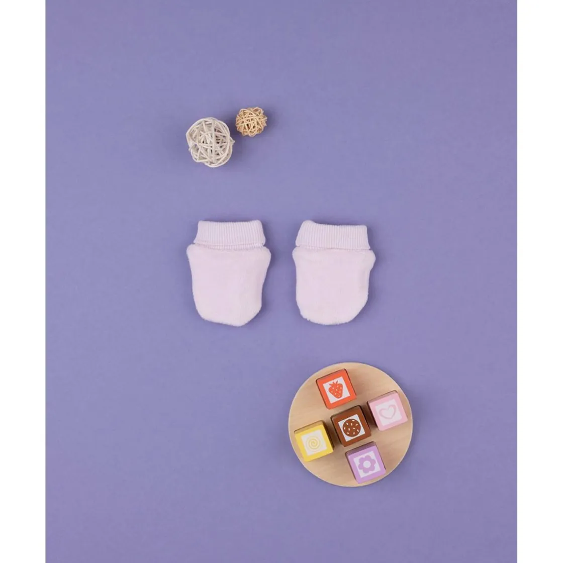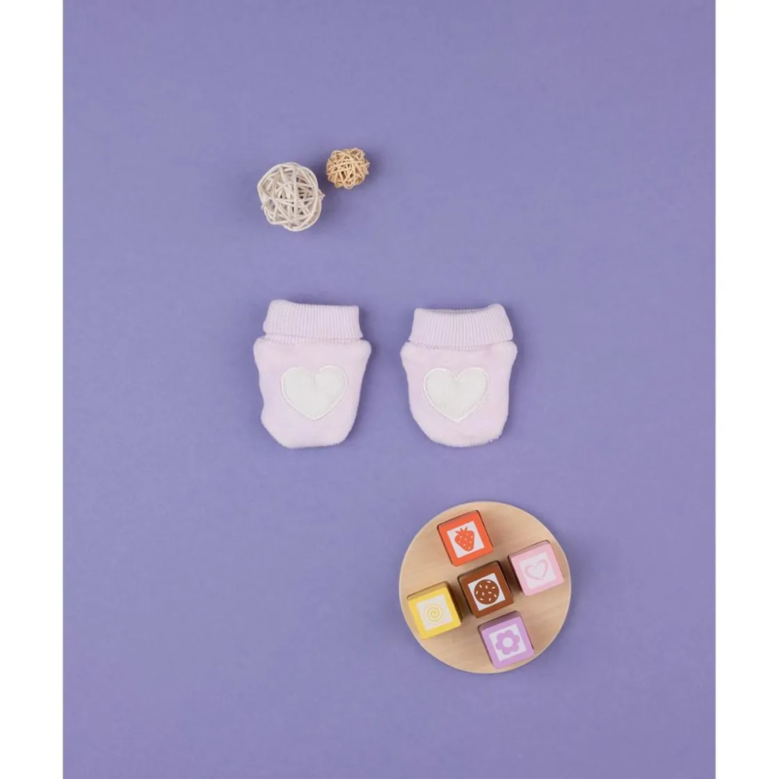 Estas adorables manoplas para recién nacida están hechas de felpa en un suave tono rosa claro y cuentan con un corazón blanco en contraste. Los puños de canalé a juego aseguran un ajuste cómodo, siendo ideales para los días más fríos.