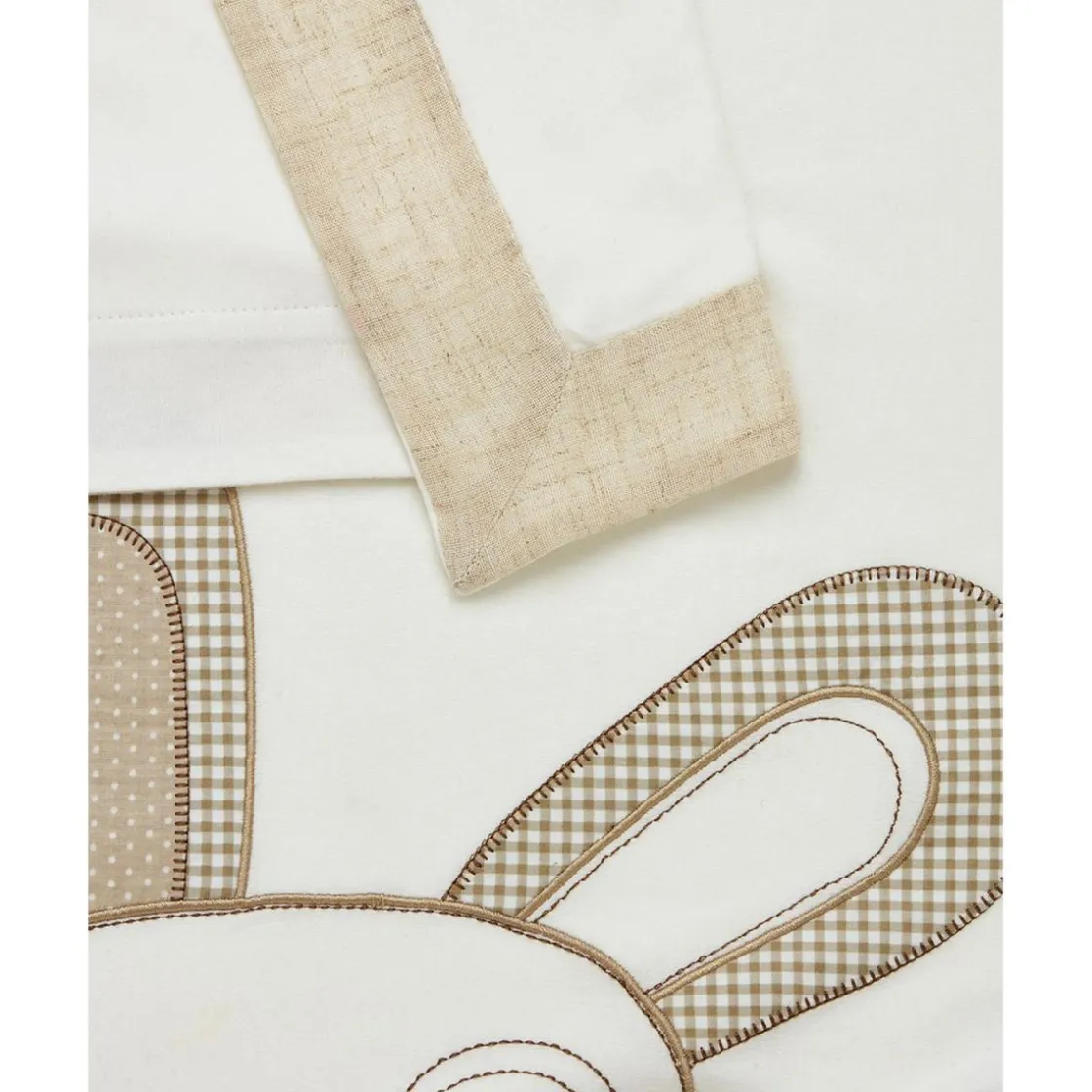 De color blanco, luce un adorable bordado de perrito en tonos beige con detalles en patchwork. Un elegante borde de lino beige completa el diseño.
