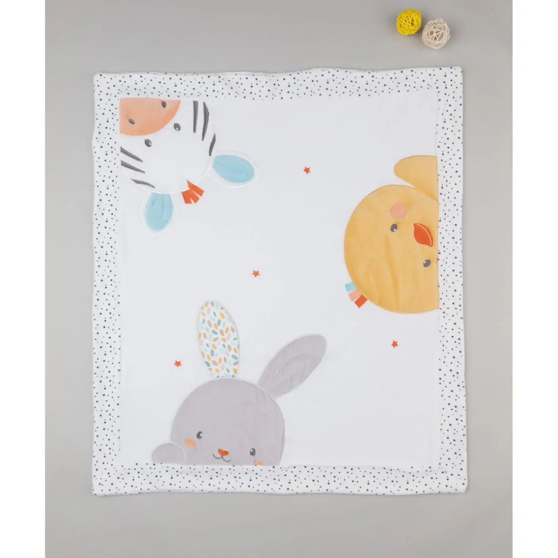 Suave manta de cuna en terciopelo de la línea Baby Smile. Presenta divertidos animalitos de colores sobre fondo blanco.