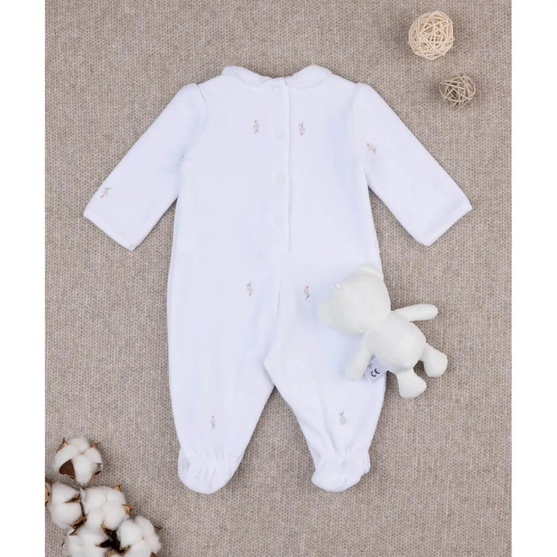Tierno enterizo de terciopelo para niña. La prenda se presenta en una sola pieza con pies y se desarrolla en total blanco con cuello. Pequeñas flores bordadas por todas partes. El ajuste es suave y práctico gracias a los botones automáticos en la parte posterior y la entrepierna. Osito de regalo en el empaque
