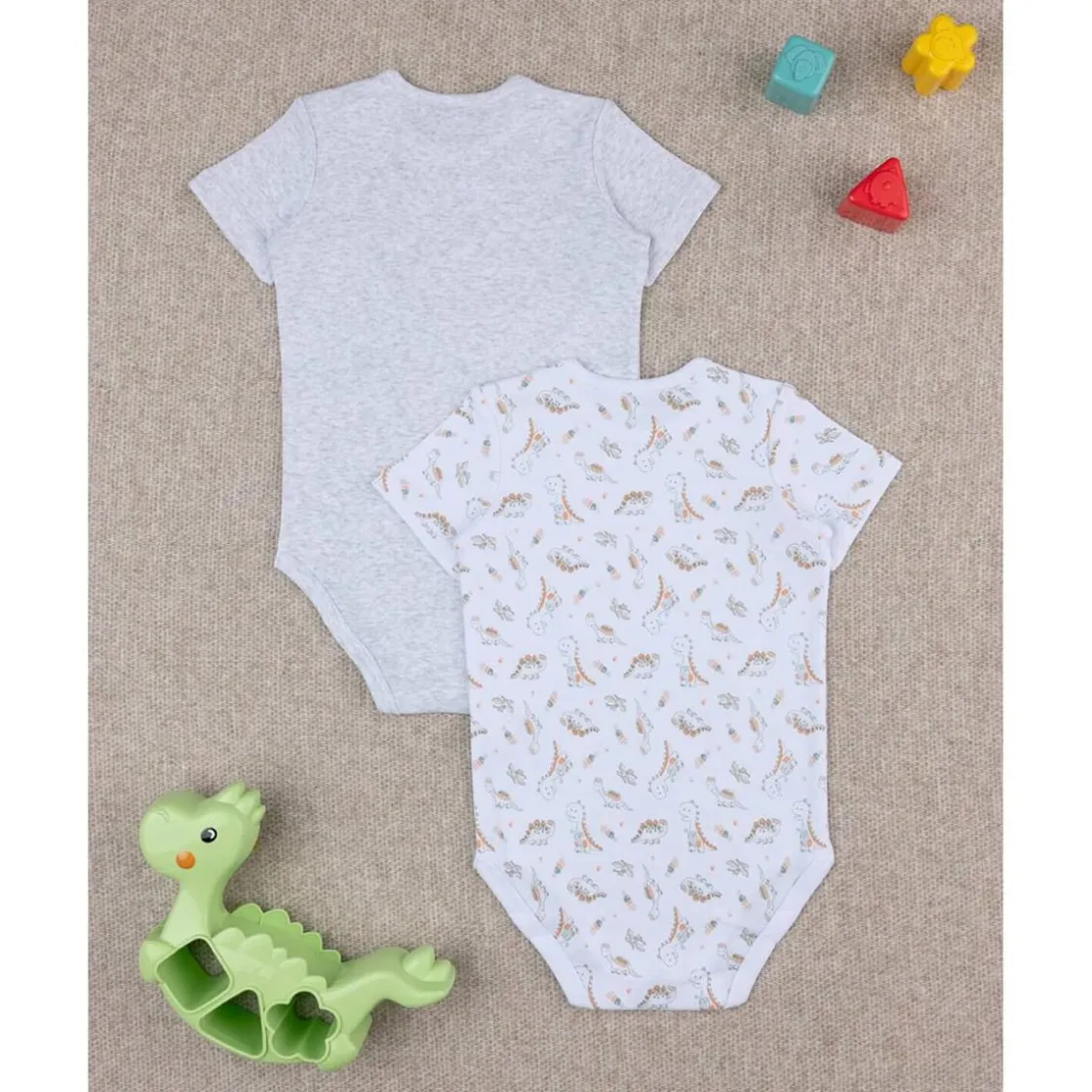 Pack básico de 2 bodies costina para niño. Las prendas se desarrollan sobre base blanca con estampado Dino en color coordinado. El ajuste es holgado y práctico gracias a botones automáticos en la entrepierna. La prenda es de algodón oeko-tex, probado para sustancias nocivas y garantiza alta seguridad. Accesorios no a la venta. El paquete contiene solo la prenda de vestir.