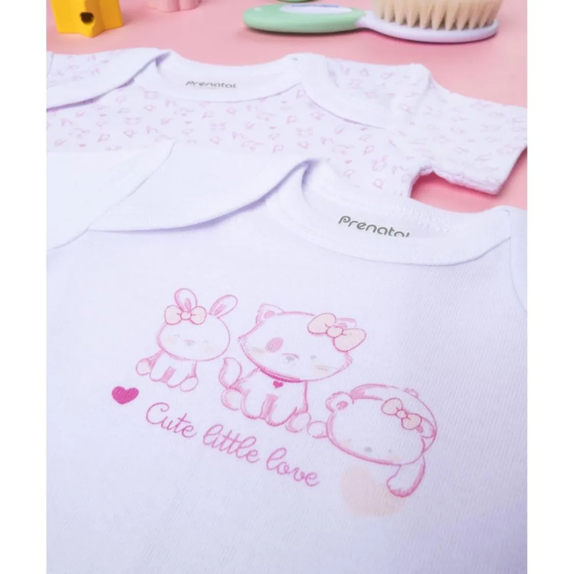 Este pack de 2 bodys interiores de manga corta está confeccionado en algodón 100% para ofrecer la máxima transpirabilidad y confort. Ambos modelos son en fondo blanco: uno de ellos presenta un estampado all-over con adorables gatitos delineados en rosa suave, mientras que el otro incorpora un diseño central con tres gatos estilizados acompañados del texto “Cute Little Love”.