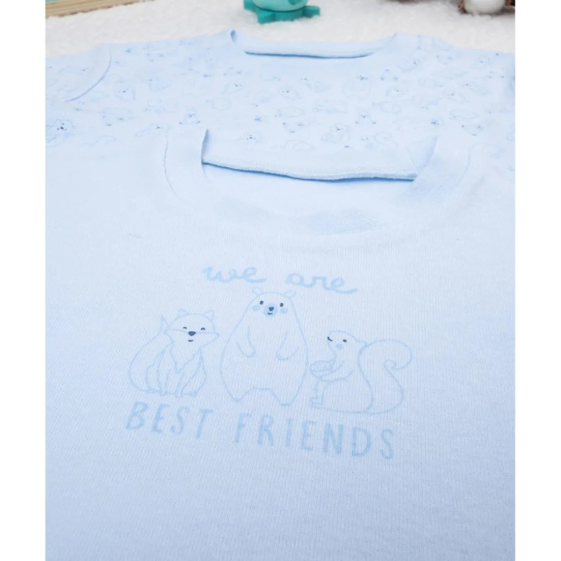Pack casual 2 camiseta de niño algodón orgánico. Las prendas son de mangas largas sobre base azul con estampado de dibujos del bosque tono sobre tono. El ajuste es suelto y regular. La prenda es de algodón oeko – tex, probado para sustancias nocivas garantiza alta seguridad. Accesorios no a la venta. El paquete contiene solo la prenda de vestir