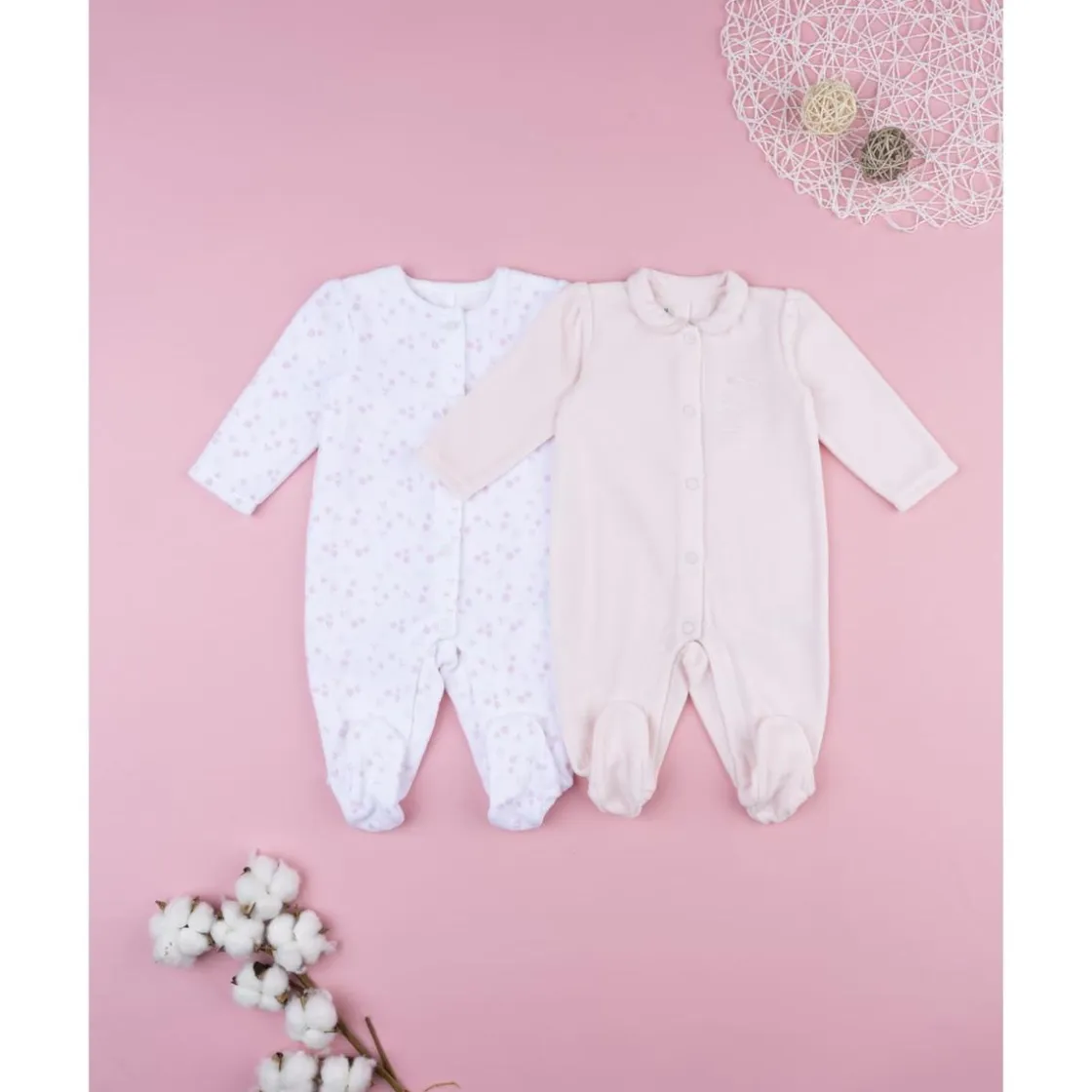Pack 2 pijamas de bebé rosa y blanco en terciopelo