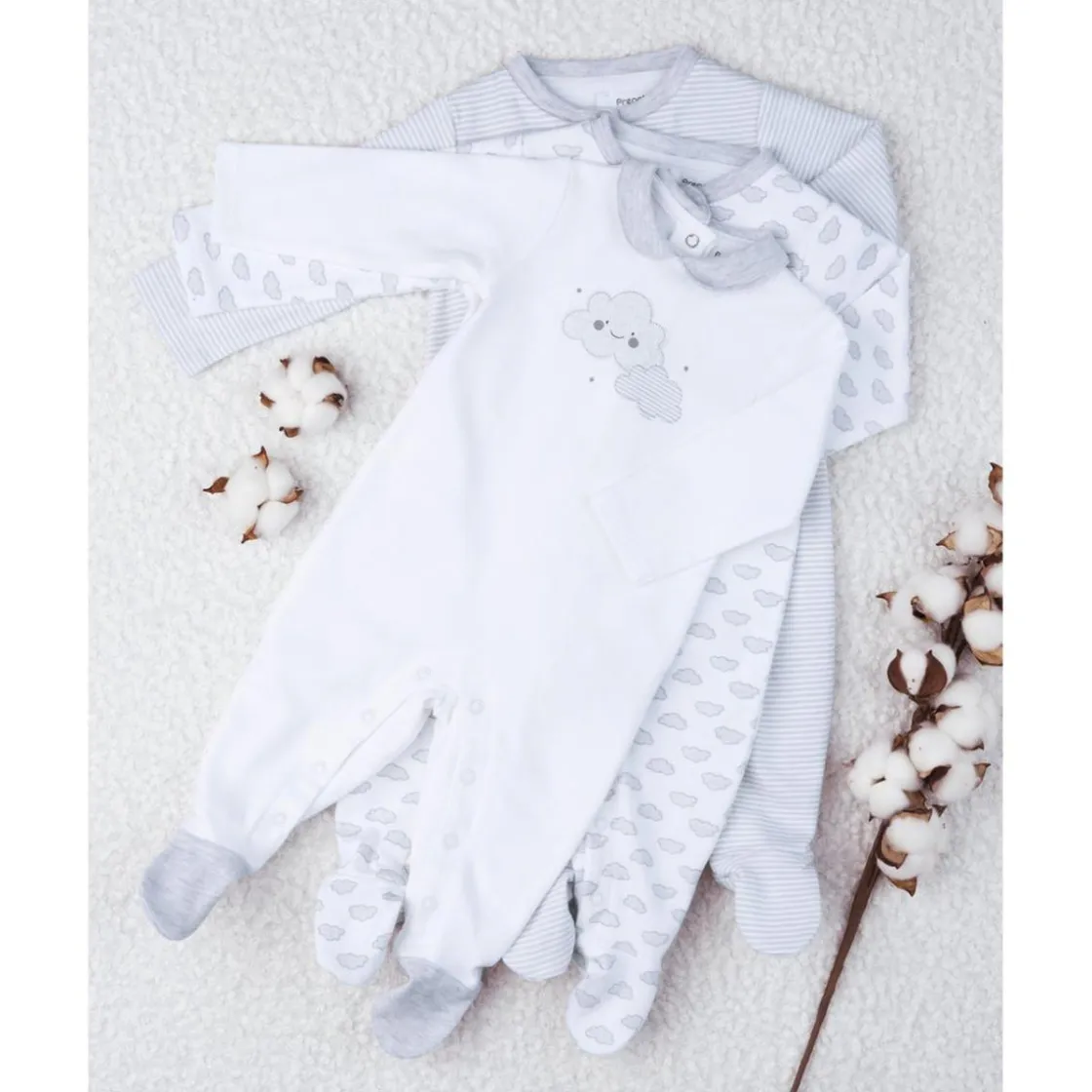 Adorable pack de 3 pijamas para niña en algodón grueso. Las tres prendas tienen mangas largas y pies cubiertos. El tono de los pijamas varía del blanco al gris claro y están adornados con suaves estampados de nubecitas o rayas horizontales. Los tres artículos presentan cuellos redondos en versión peter pan o simples y prácticos botones automáticos en el frente o en la parte trasera que permiten un fácil vestir. Accesorios no disponibles para la venta. El paquete contiene solo la prenda de vestir.