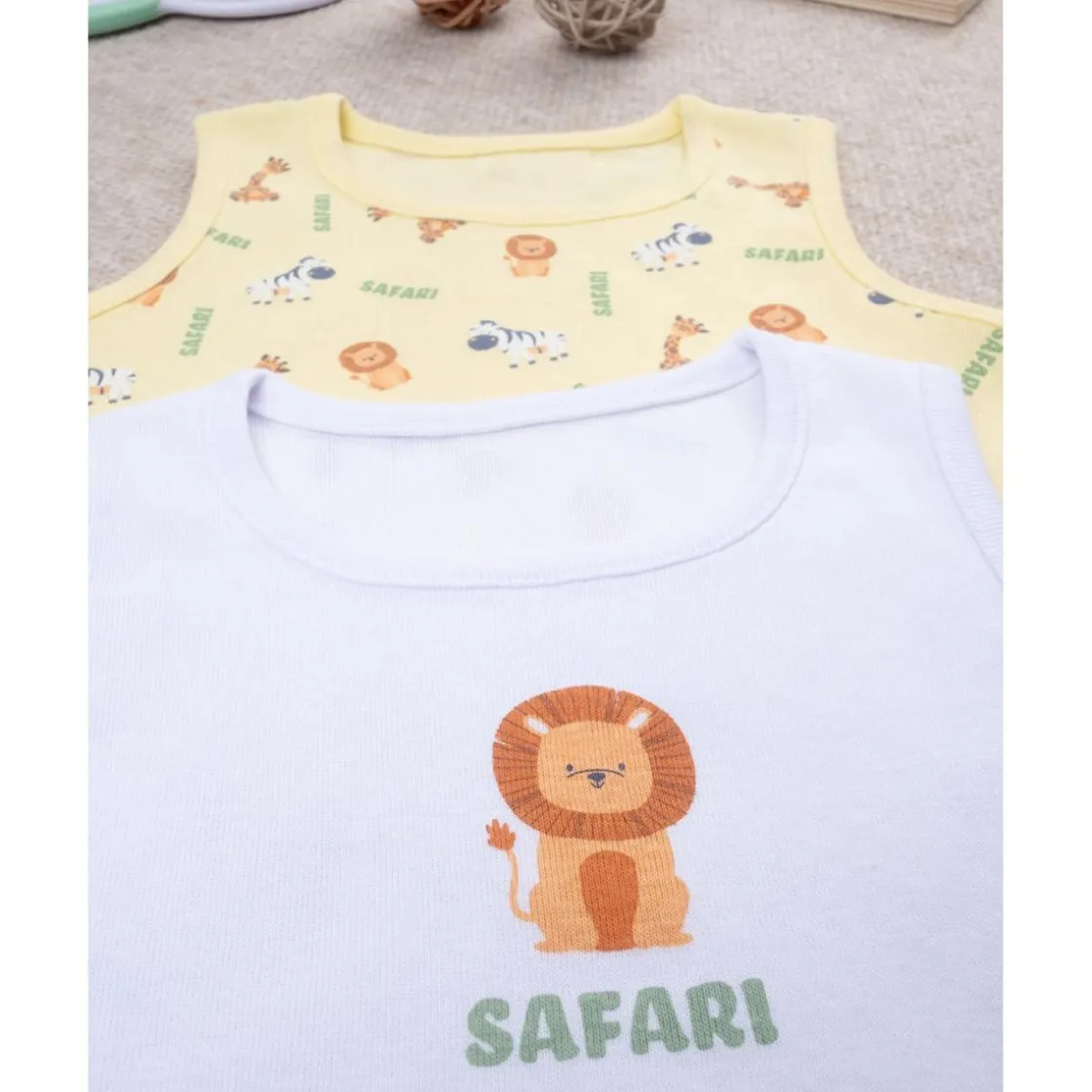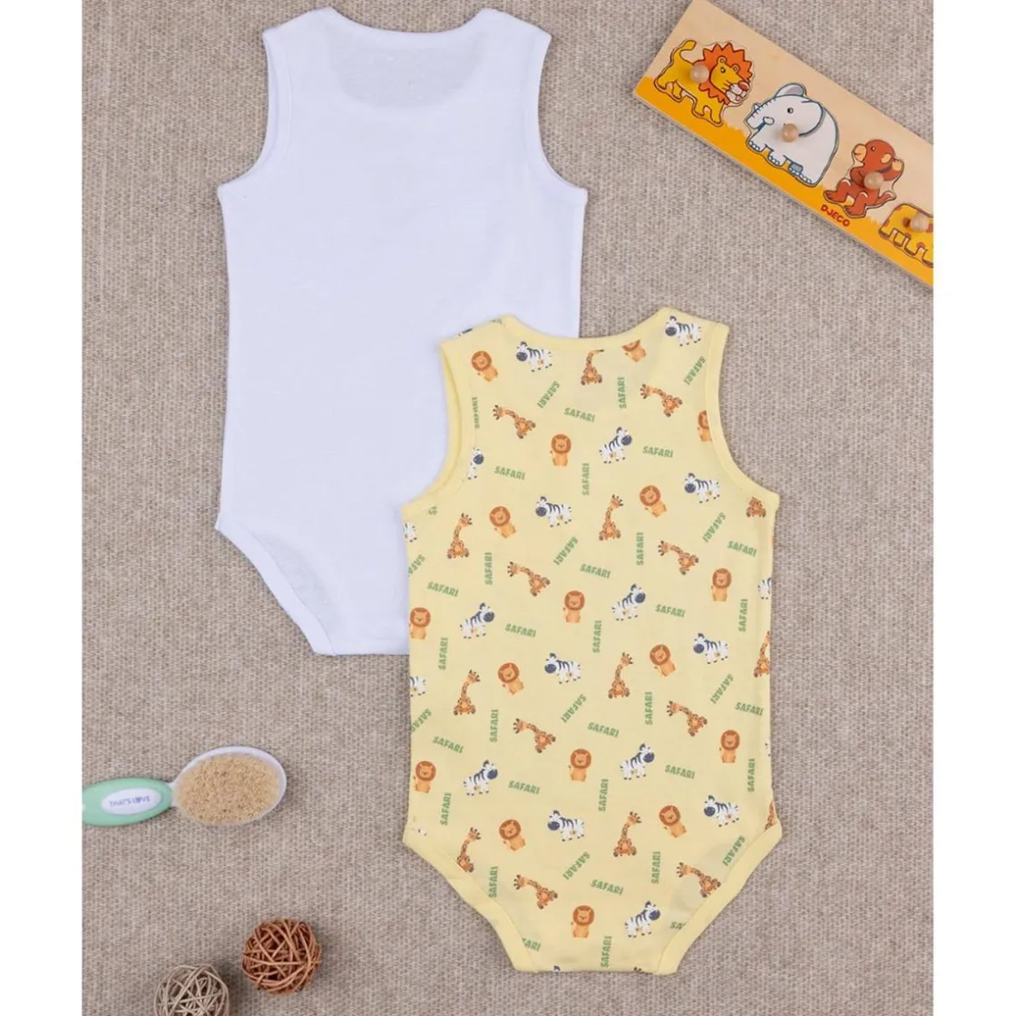 Este pack de 2 bodies, confeccionados en algodón orgánico, es una opción práctica y cómoda para el día a día. Los bodies están diseñados con base blanca y amarilla y estampados con motivos Safari en tonos coordinados. La prenda es fácil de poner y quitar gracias a los botones automáticos en la entrepierna. Están fabricados con algodón Oeko-Tex, que asegura que el material está libre de sustancias dañinas.