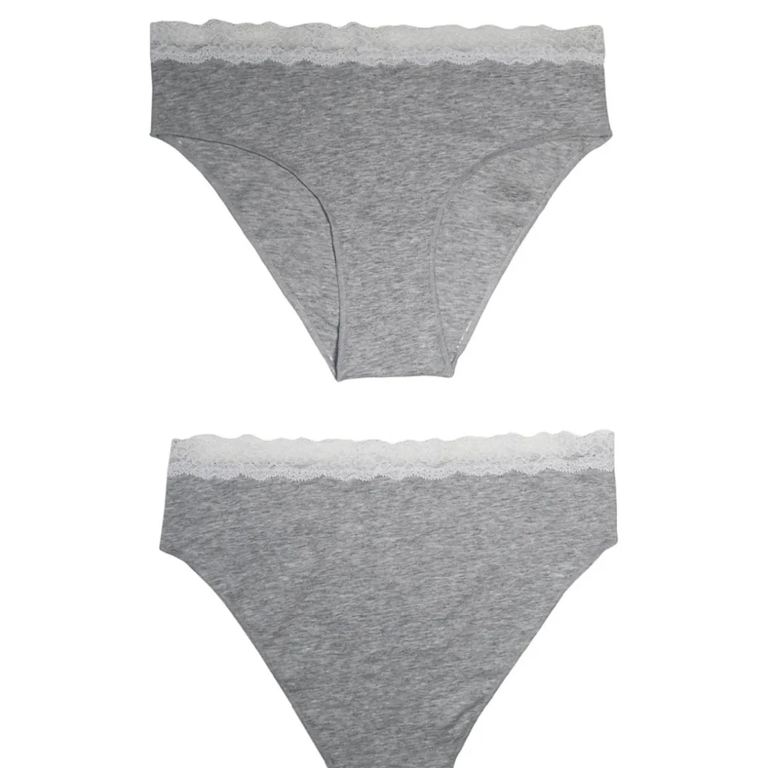 Paquete romántico compuesto por dos pares de braguitas de algodón gris claro jaspeado. En la cintura se aplica un encaje de color blanco