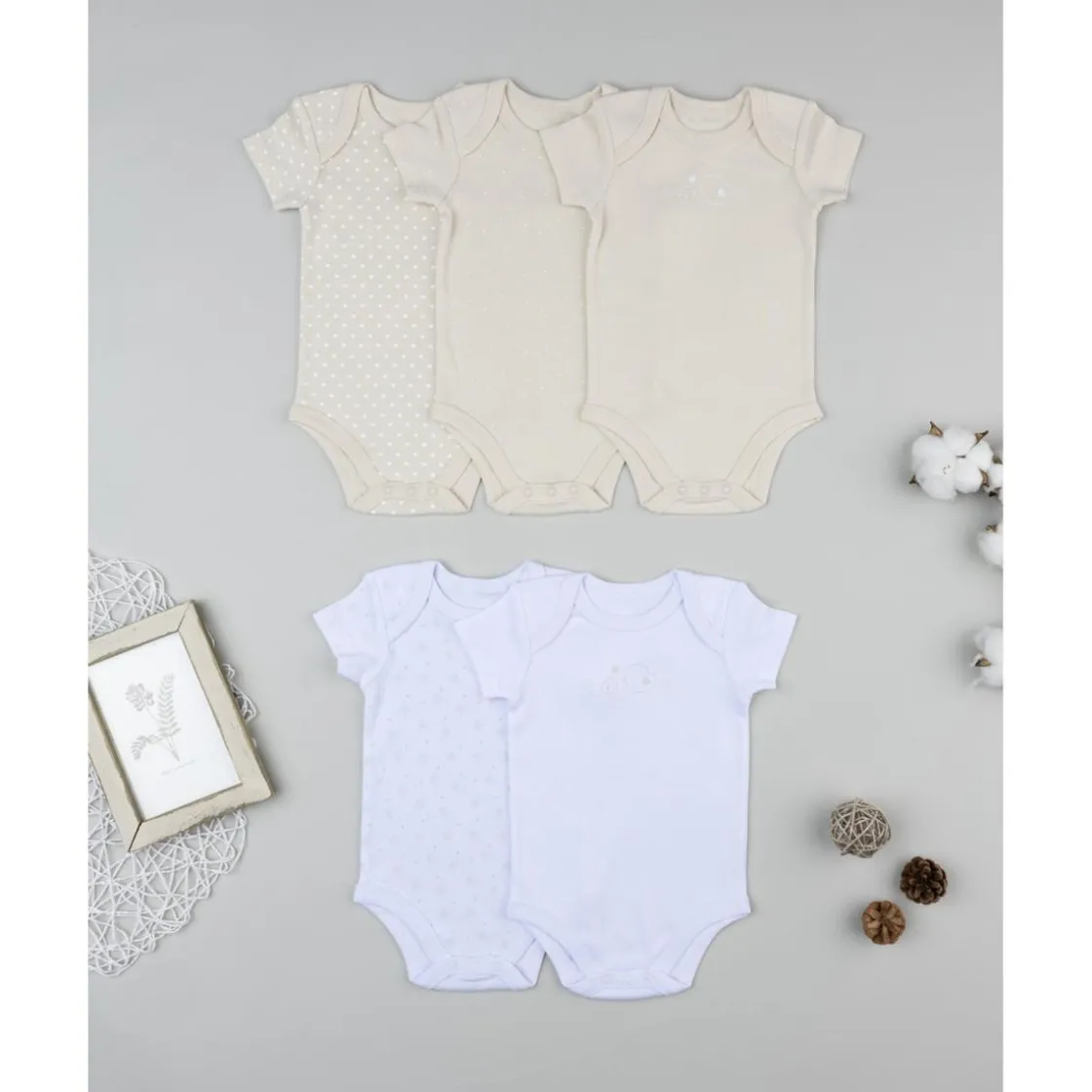 Cuida la piel de tu bebé con este pack de 5 bodies de manga corta en tonos beige y blanco con estampados suaves. Diseñados para una vestibilidad práctica, incorporan botones automáticos en la entrepierna para facilitar el cambio.