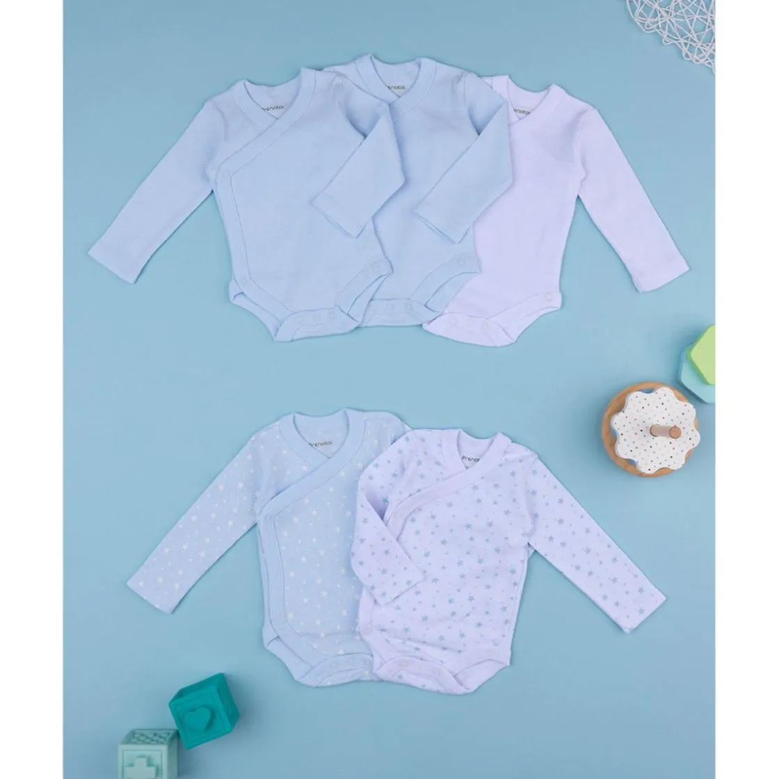 Paquete de cinco bodies con mangas largas y apertura lateral. Los bodies están en tonos de blanco y azul, con estampados y patrones de estrellitas en contraste. Cierre en la entrepierna con prácticos botones a presión. Accesorios no a la venta. El paquete contiene solo la prenda de vestir.