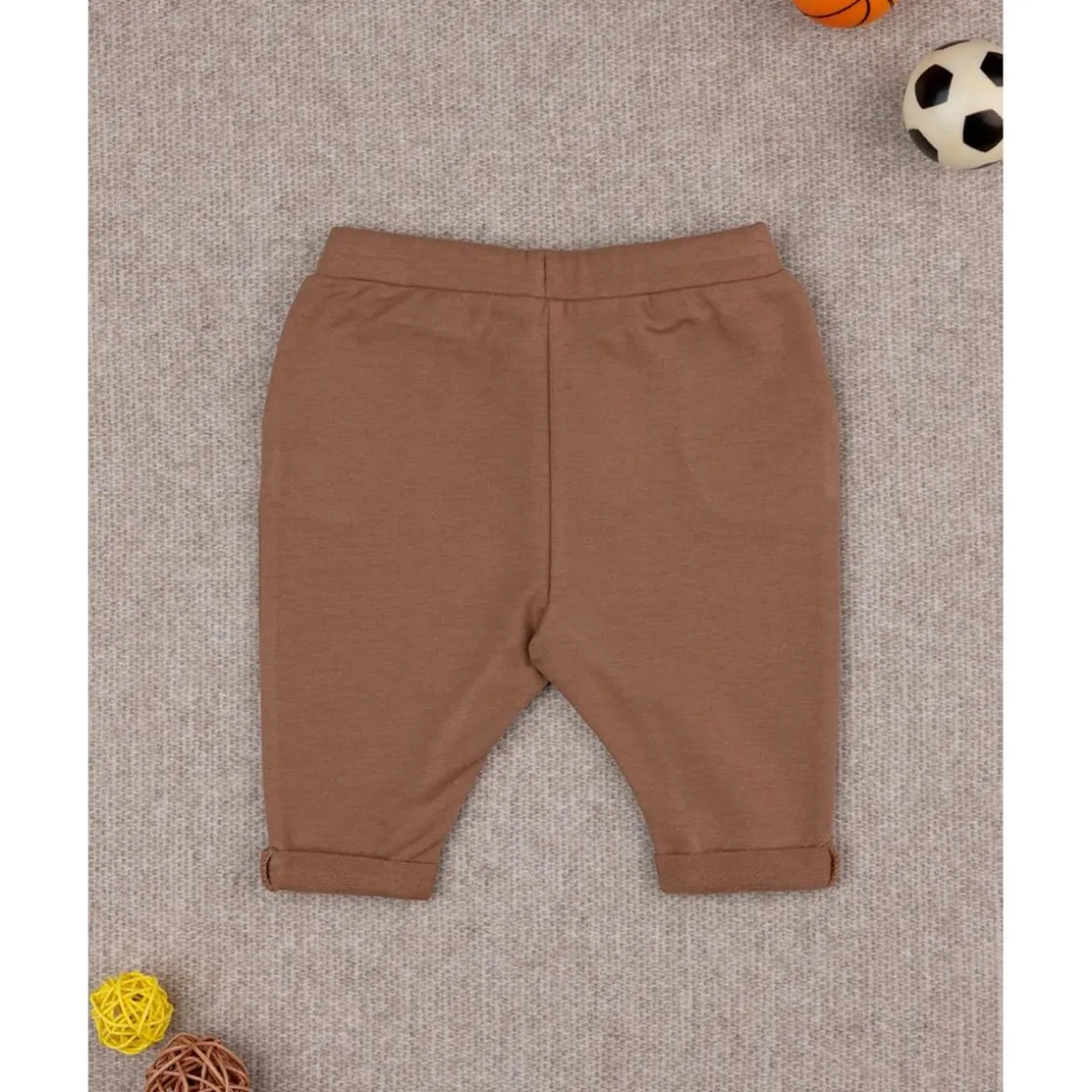 Pantalón casual French terry para niño en marrón total con bolsillos diagonales. Ajuste cómodo y regulable con cordón en la cintura. Ideal para ocasiones casuales. Algodón Oeko-Tex certificado. Solo prenda incluida.