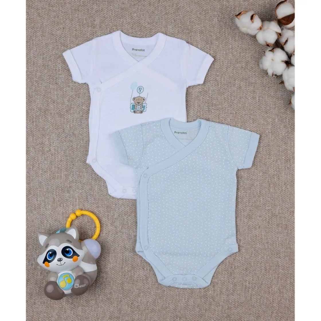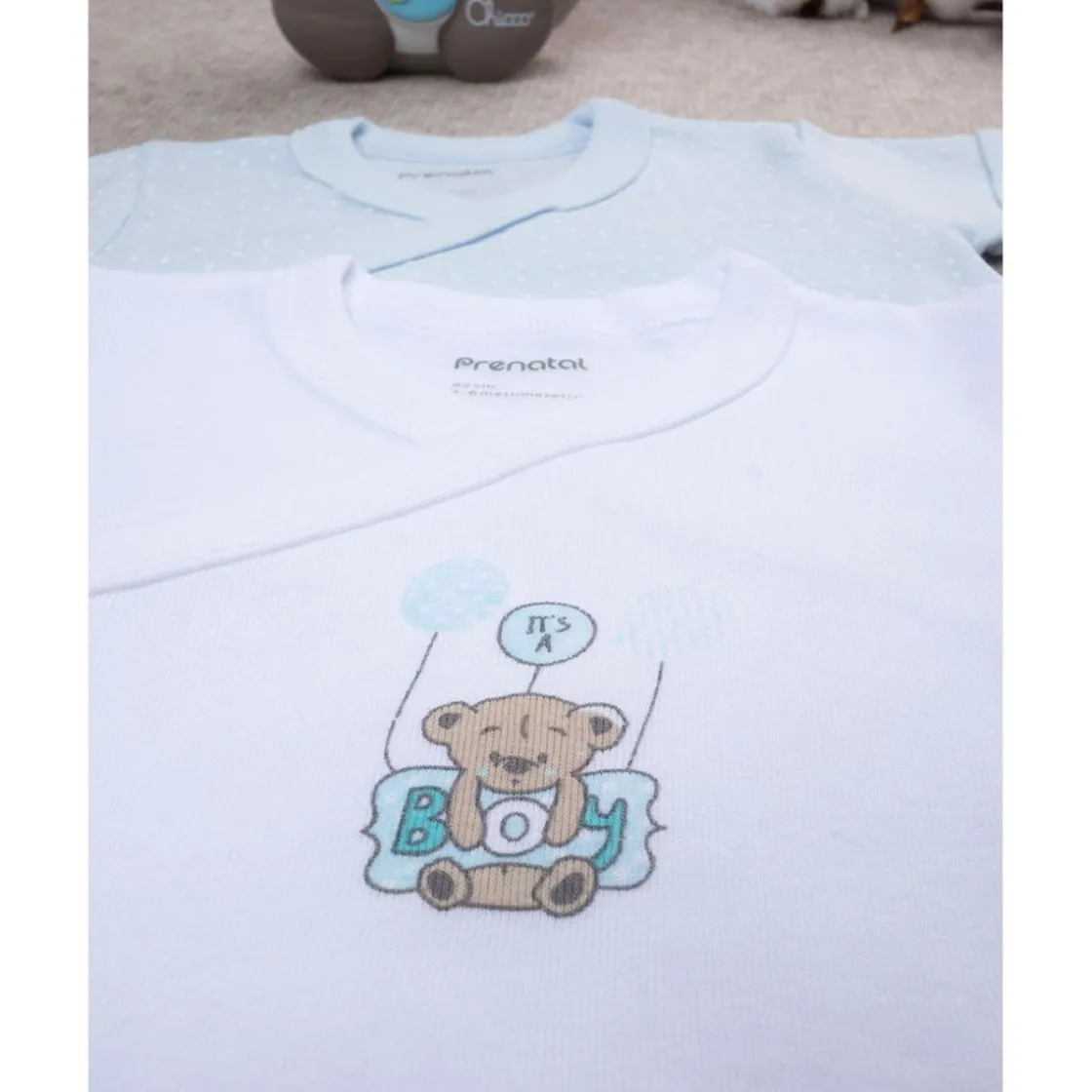 Práctico pack compuesto por dos bodies con mangas cortas, cierre lateral y en la entrepierna con automáticos. Un body es blanco con estampado de un simpático osito con globos y la inscripción «It’s a boy» en el centro; el otro es celeste con estampado all-over de estrellitas blancas. Accesorios no en venta. El paquete contiene solo la prenda de vestir.