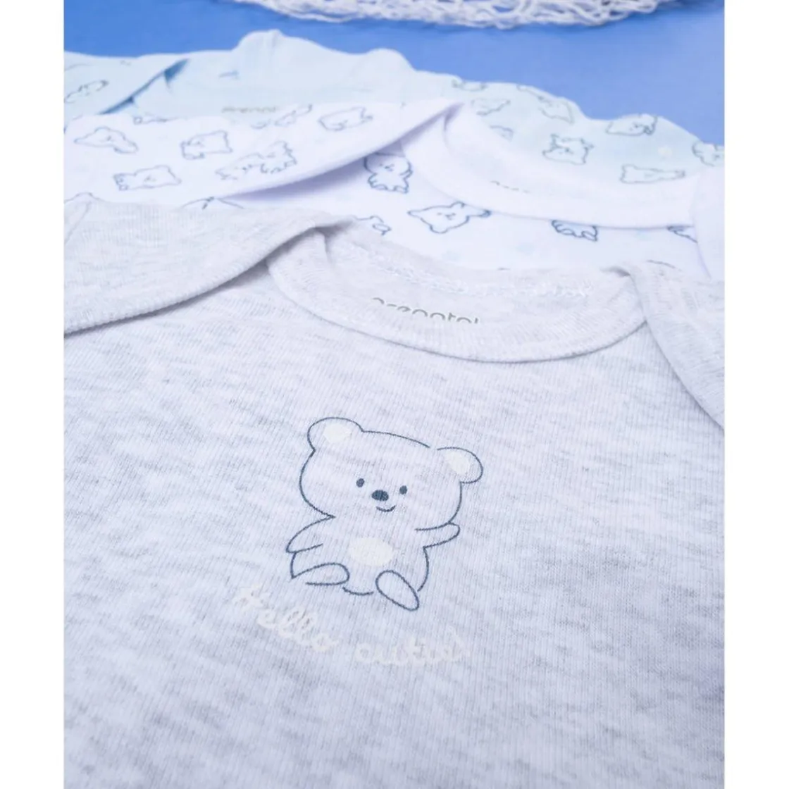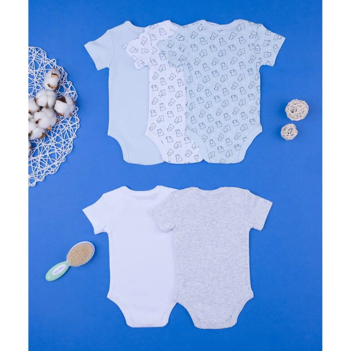 Pack de 5 bodies de bebé en canalé de manga corta. Los bodies se presentan en tonos de gris, azul y blanco y están enriquecidos con estampados de osito en contraste. Ajuste práctico y cómodo gracias al cierre con prácticos botones de presión y al escote americano. Accesorios no a la venta. El paquete contiene solo la prenda de vestir.