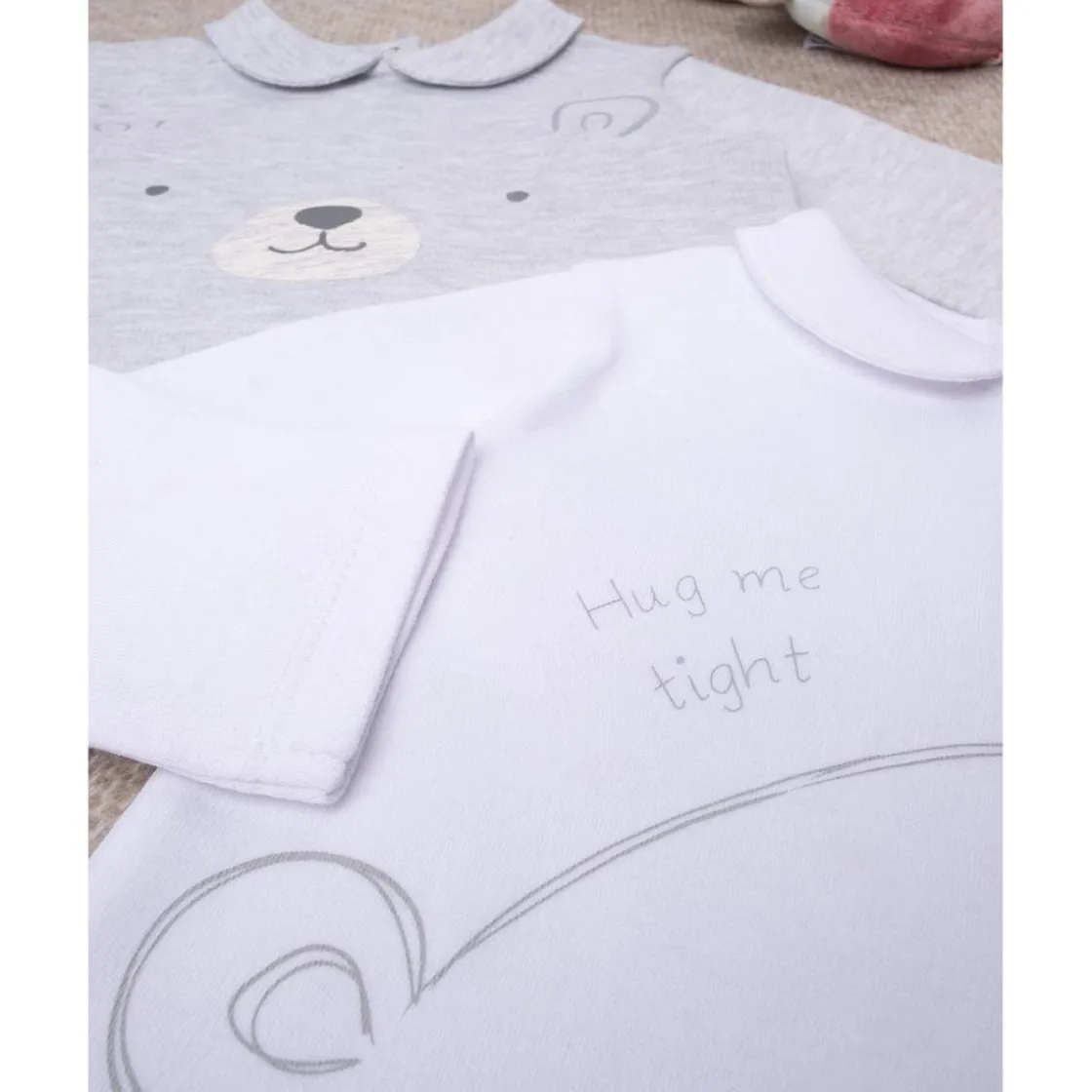 Tierno pack 2 conjuntos set 2 piezas unisex. Las prendas se desarrollan en tonos blanco y gris claro y se componen de camiseta de manga larga con estampado de osito y cuello redondo tipo Peter Pan más botones automáticos en la parte trasera; pantalón en una sola pieza con pies coordinados sobre fondo a rayas y elástico en la cintura para un ajuste regulable. Accesorios no a la venta. El paquete contiene solo la prenda de vestir.