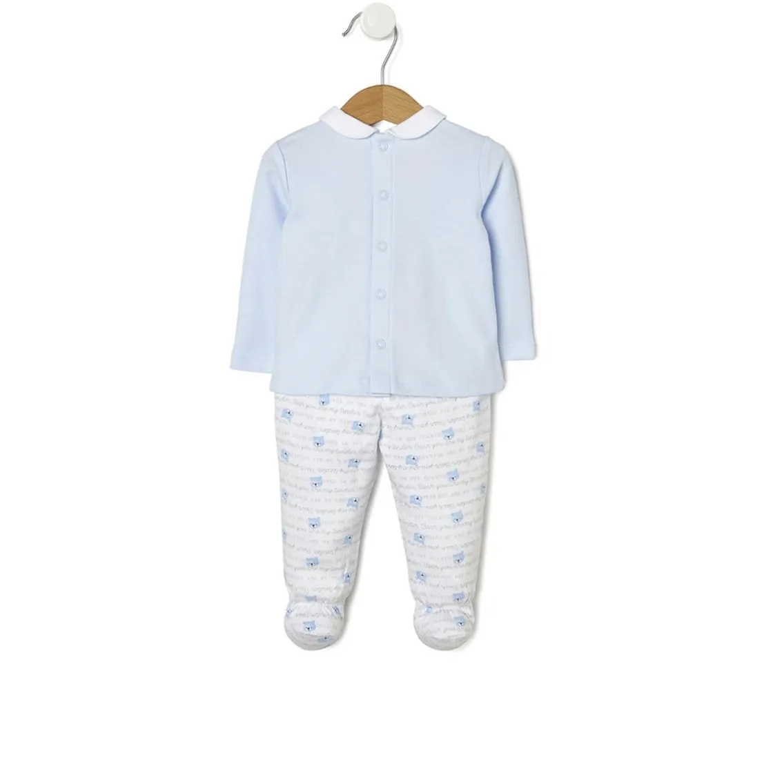 Práctico pack compuesto por dos conjuntos con camiseta de manga larga y cuello redondo y pantalones largos a juego. Un conjunto tiene la impresión de dos simpáticos ositos en la parte delantera y pantalones con estampado integral de ositos y escritos; el otro tiene la camiseta blanca con estampado integral de ositos y escritos y pantalones azules.