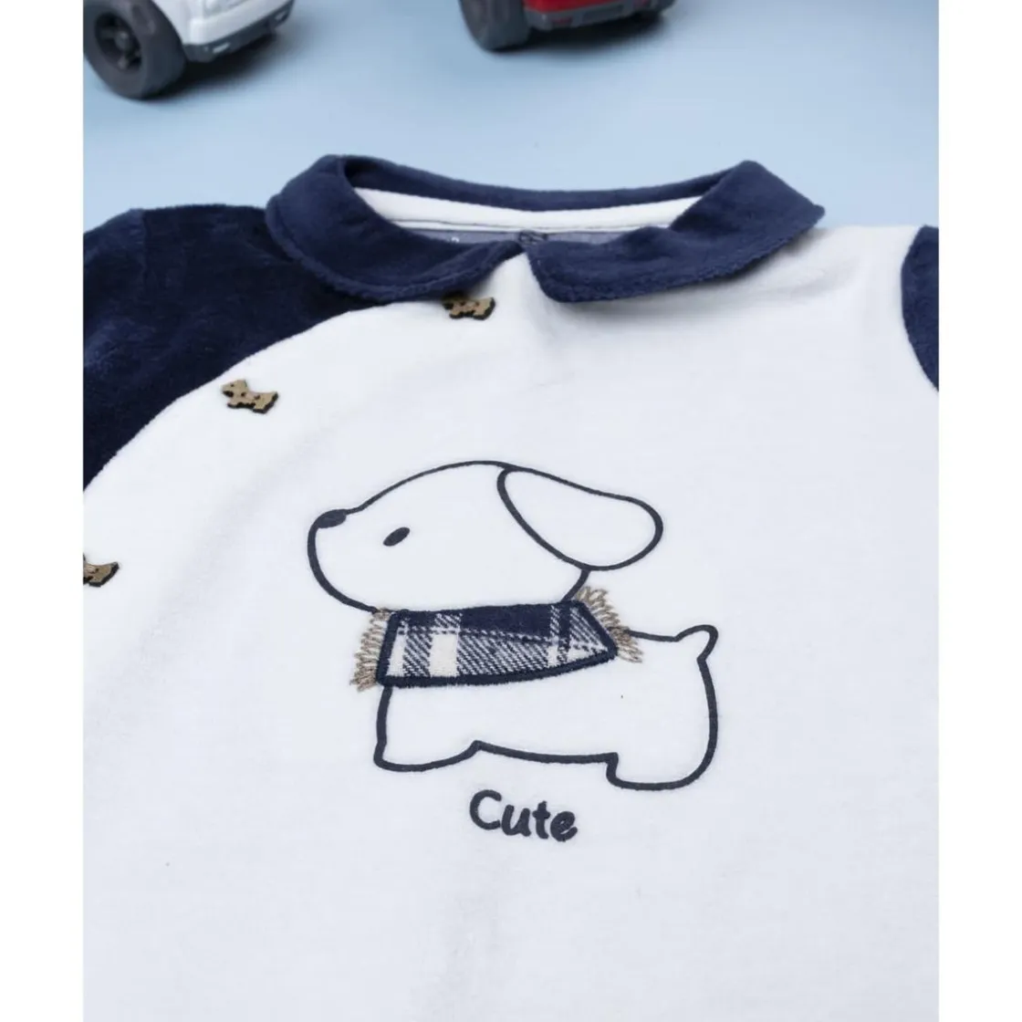 El pelele de terciopelo para niña combina blanco y azul con un delicado bordado de perrito. Su diseño de una sola pieza con pies integrados asegura comodidad y calidez.