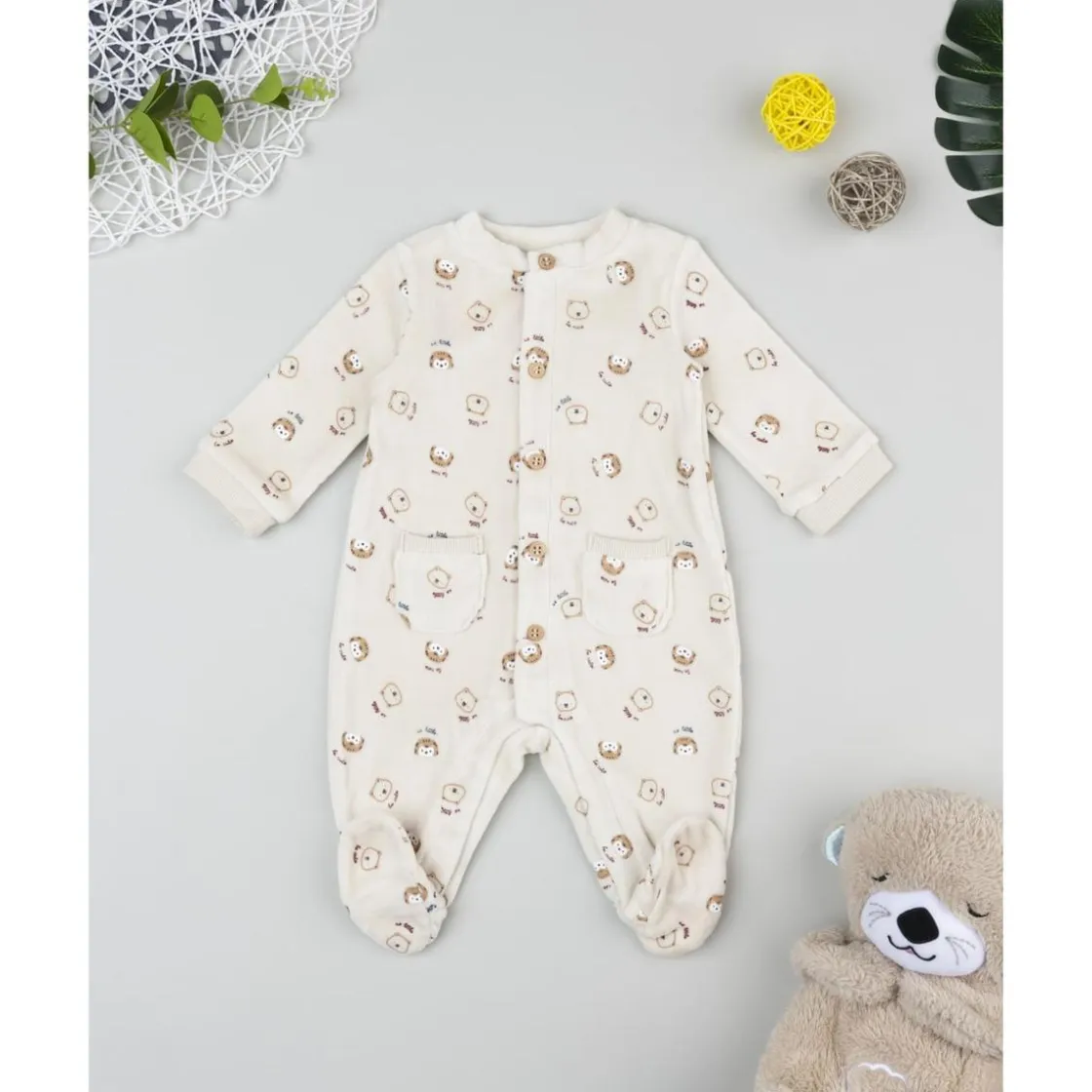 El pelele de terciopelo beige para recién nacido es una prenda suave y confortable. Presenta estampado allover de pequeños animales, con bolsillos aplicados en la parte frontal que aportan encanto al diseño.