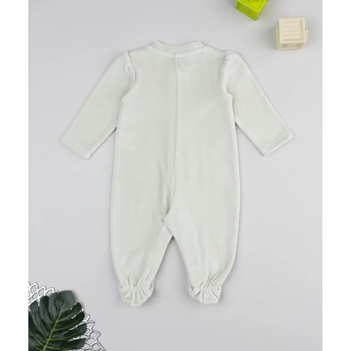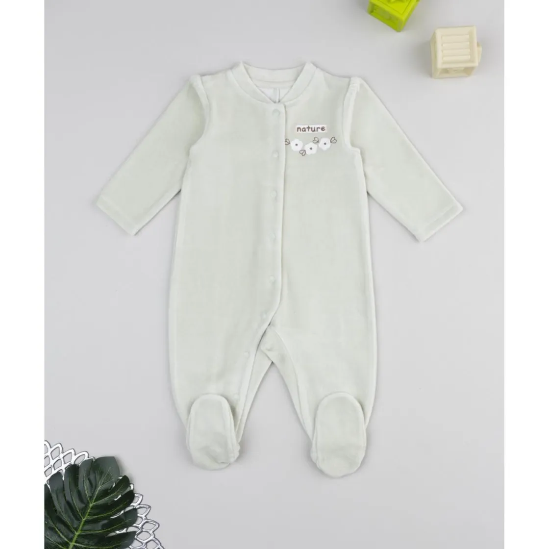 Adorable pelele de una pieza para niña en suave terciopelo. Con pies incorporados, en un bonito tono verde y con pequeña imagen a juego. Ajuste cómodo gracias a los botones automáticos al frente y en la entrepierna. Confeccionado en algodón certificado Oeko-Tex, seguro y delicado para la piel del bebé. Accesorios no incluidos. La caja contiene solo la prenda.