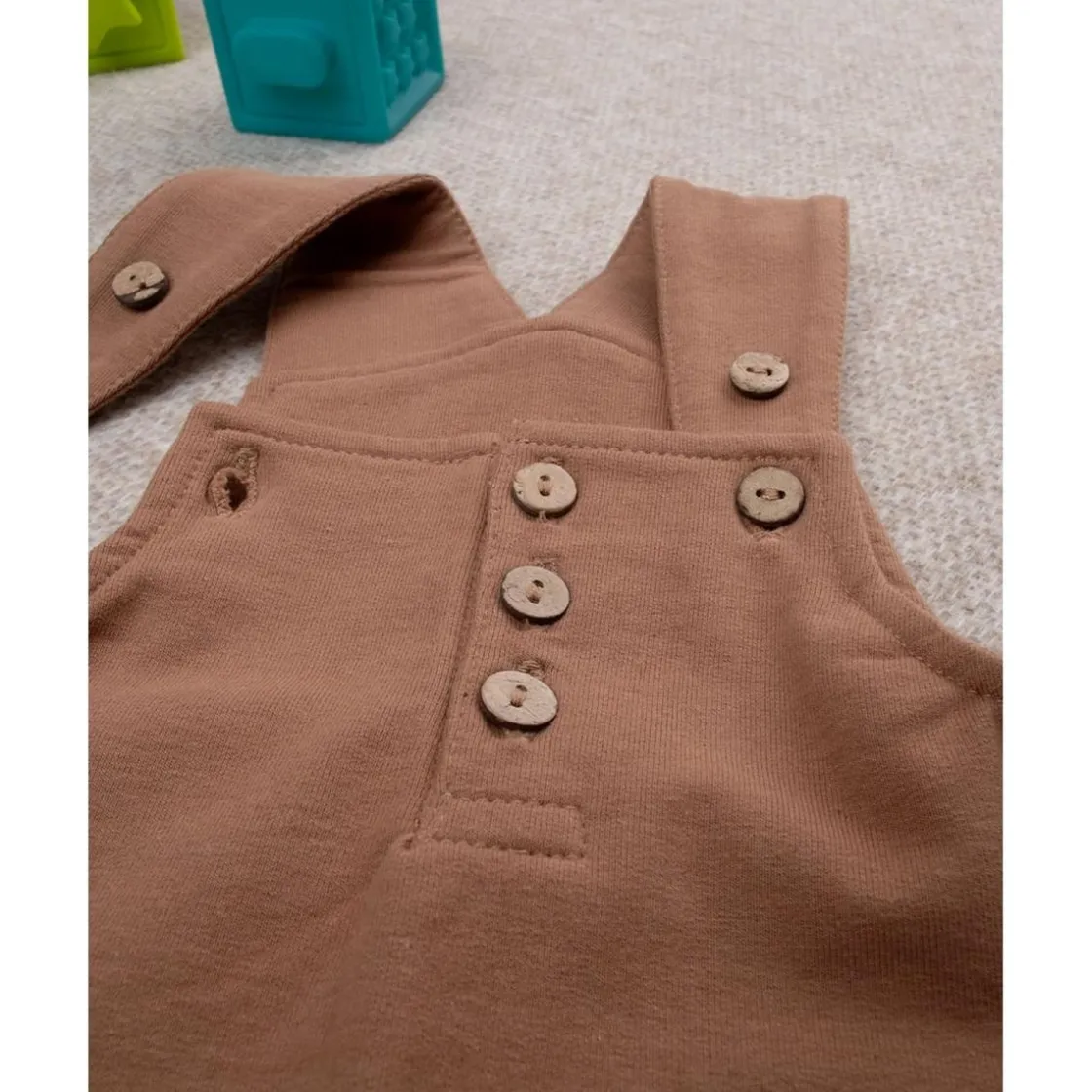 Peto casual para niño en marrón total, con botones automáticos en tirantes y entrepierna para un ajuste práctico. Ideal para ocasiones casuales. Algodón Oeko-Tex, seguro y libre de sustancias nocivas. Solo prenda incluida.