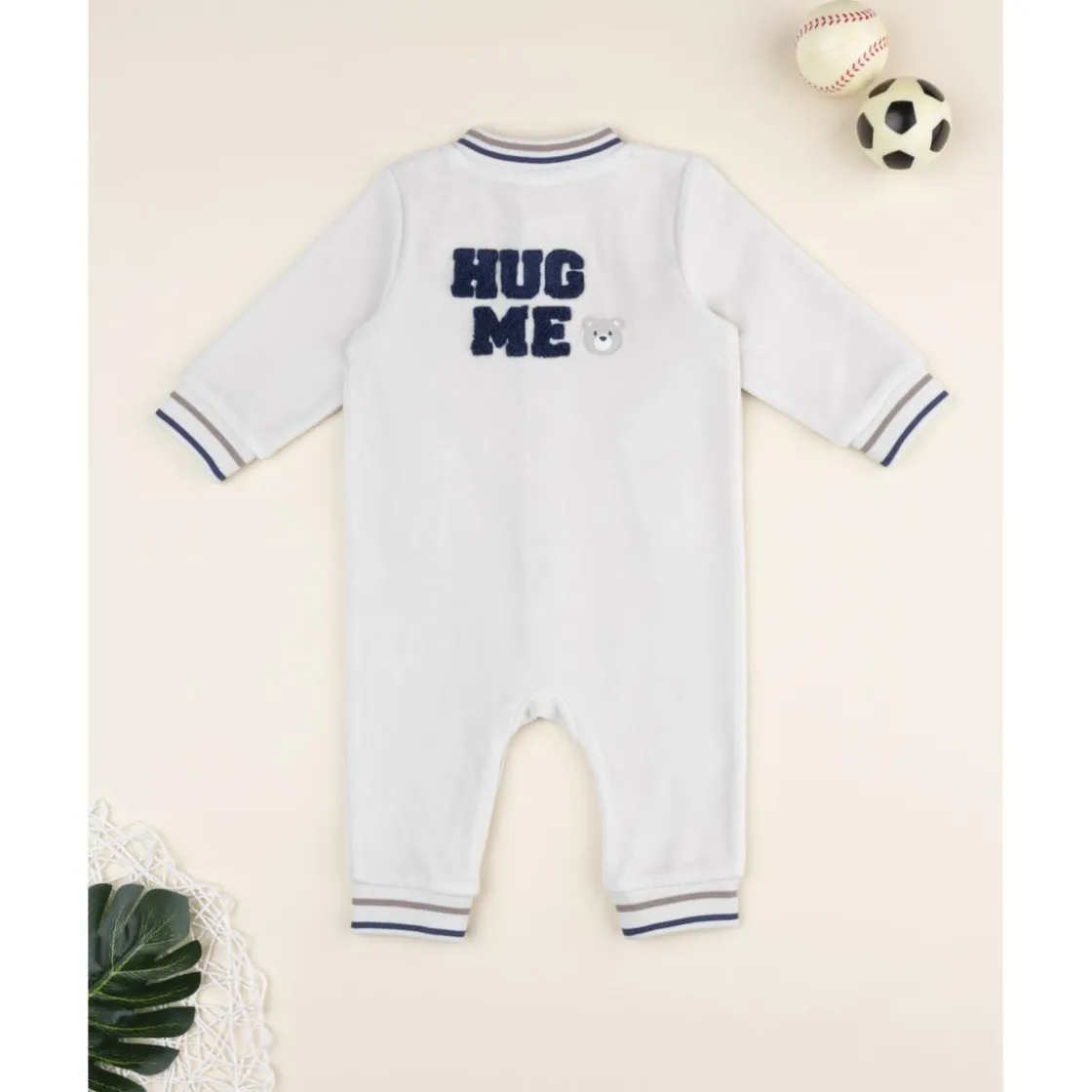 El pijama entero en suave terciopelo beige luce un parche frontal “Adorable” en azul, a juego con puños y cuello. Con apertura delantera y automáticos en la entrepierna, permite cambios rápidos sin enfriar al bebé. Tejido certificado que ofrece seguridad y confort en contacto con la piel.