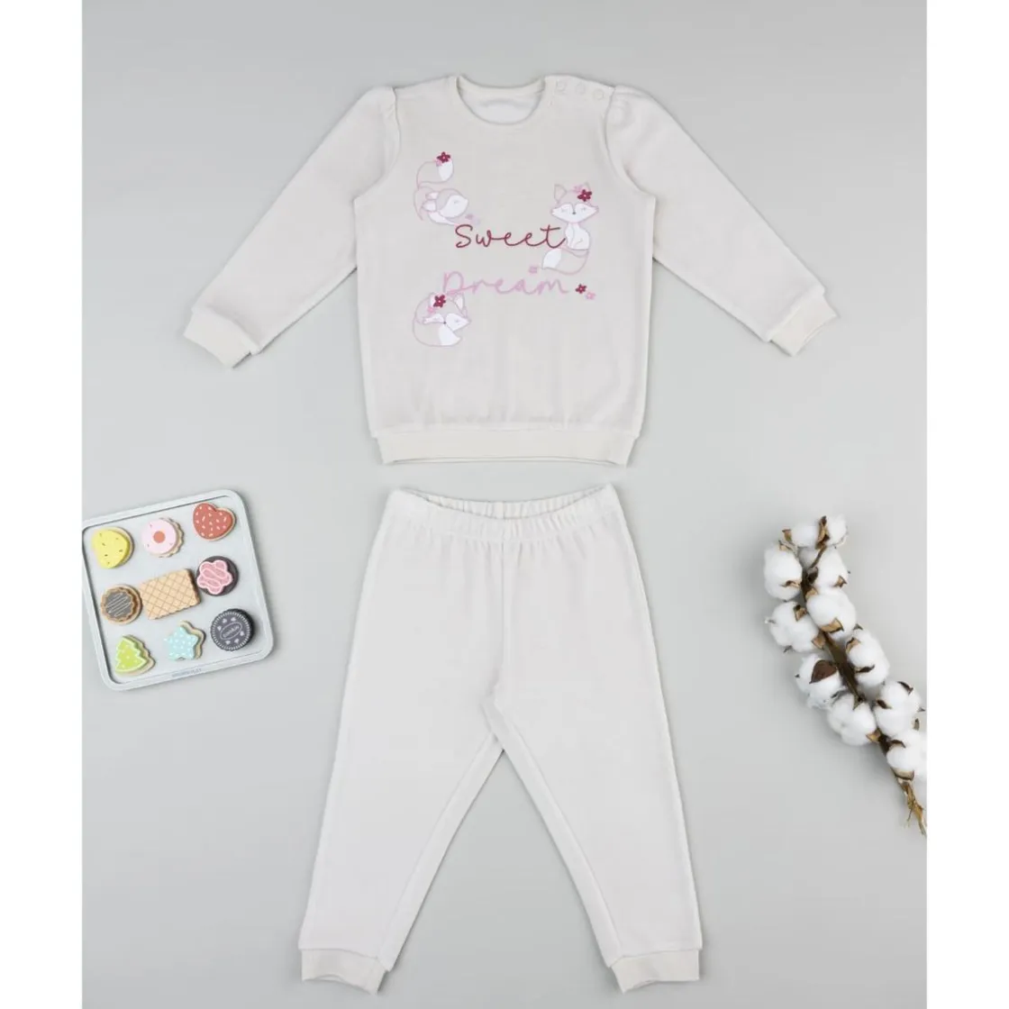 Este pijama infantil de dos piezas en suave felpa se compone de camiseta de manga larga en color beige con estampado “Sweet Dream” y pantalón a juego en tono liso. Su diseño cálido y confortable es ideal para acompañar las noches más frescas.