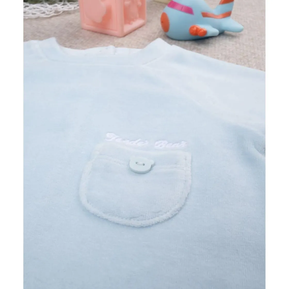 Un tierno pijama de terciopelo para niño en azul claro, diseñado en una sola pieza con pie. Incluye estampado frontal y botones automáticos en la parte trasera. Hecho de algodón Oeko-Tex para mayor seguridad.