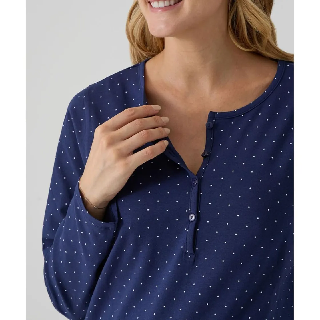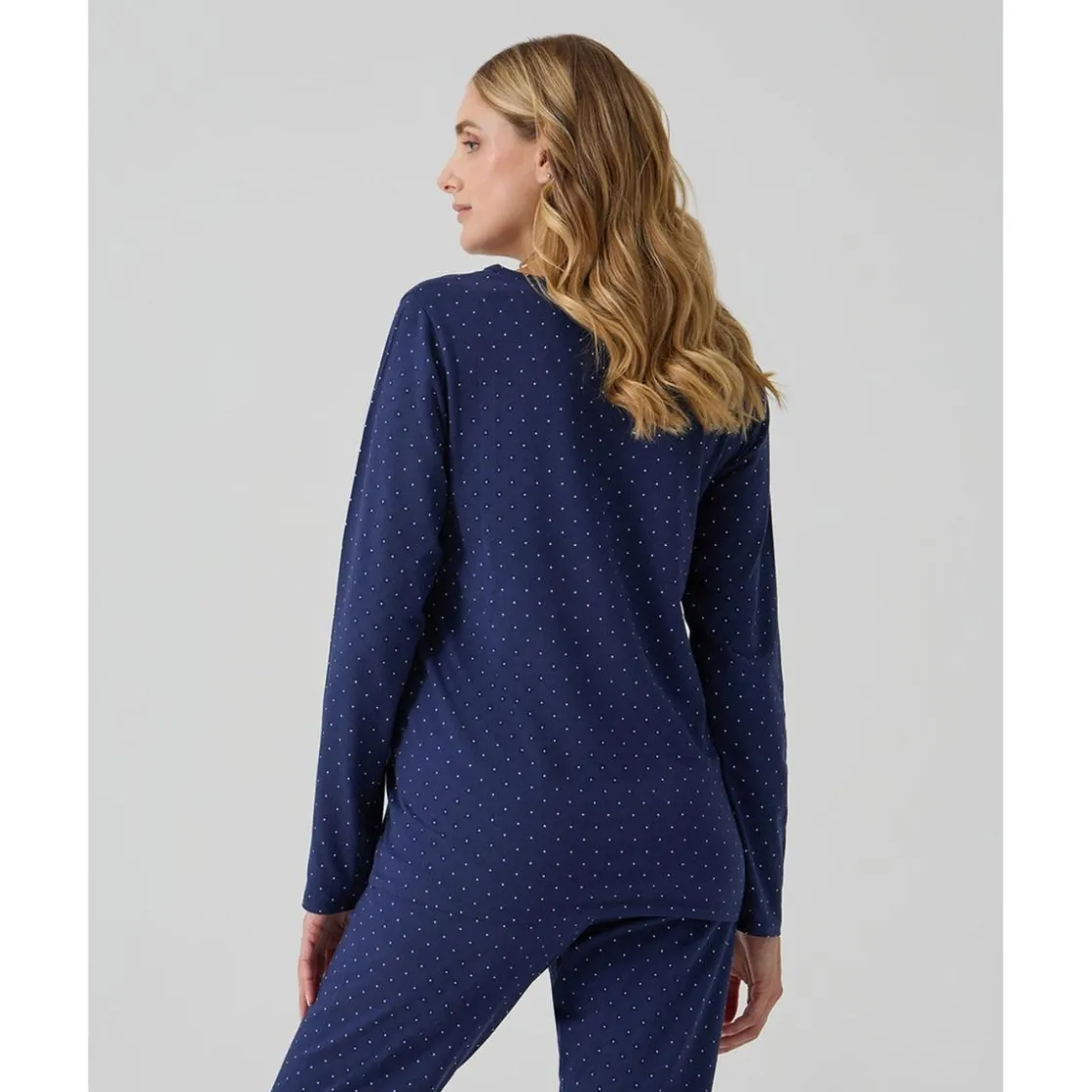 Este pijama premamá de dos piezas ha sido diseñado para el embarazo y la lactancia. Incluye camiseta de manga larga en azul con estampado de lunares blancos, escote barco y botones frontales que permiten amamantar con discreción. Los pantalones cuentan con cintura elástica para un ajuste cómodo durante toda la gestación.